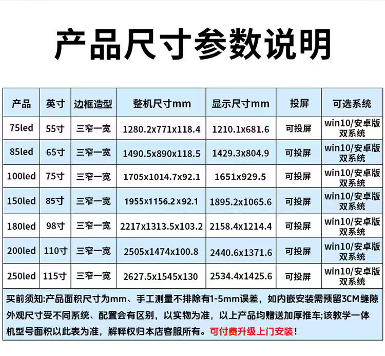 购买的 85 寸大屏,性价比非常高。书写顺滑,色彩搭配鲜艳,触屏非常精准和灵敏度高。而且还带有win 系统,双系统搭配满足办公使用的需求。客服服务态度好,及时回复各种问题。值得推荐。