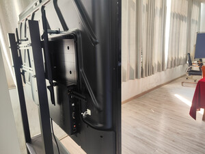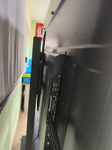 原来用的投影仪,分辨率太低不清晰,换了这款视基的85寸会议平板一体机,4k分辨率,显示非常清晰,亮度也足够,比原来的投影仪清晰多了。平板自带i7处理器和win10系统,可以不用电脑,直接打开电脑上的文档,也可以接自己的电脑,一机多用。前面板上3个USB接口,一个HDMI接口,一个typec接口,侧面还有USB和HDMI接口,可以说接口足够用。配了一条教鞭,两支手写笔,底座能移动,可以锁死。手写也比较流畅,总之非常好用。