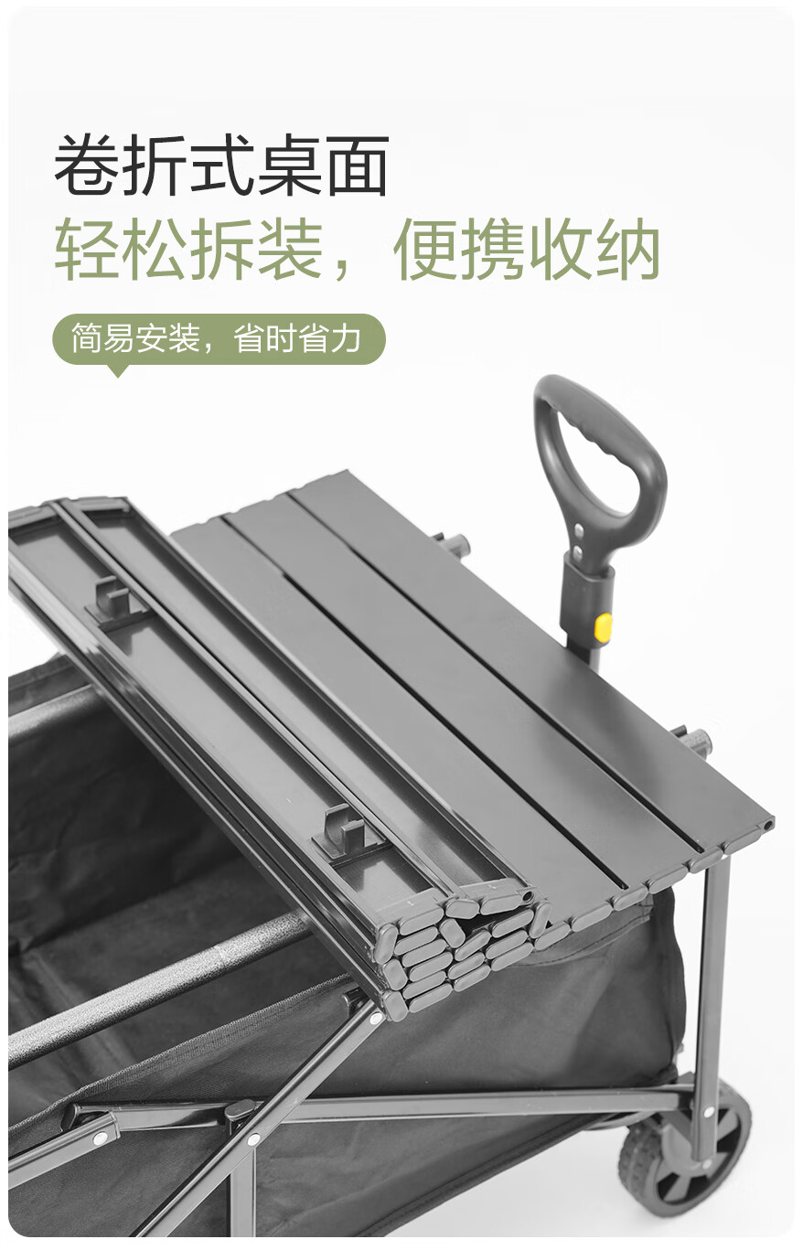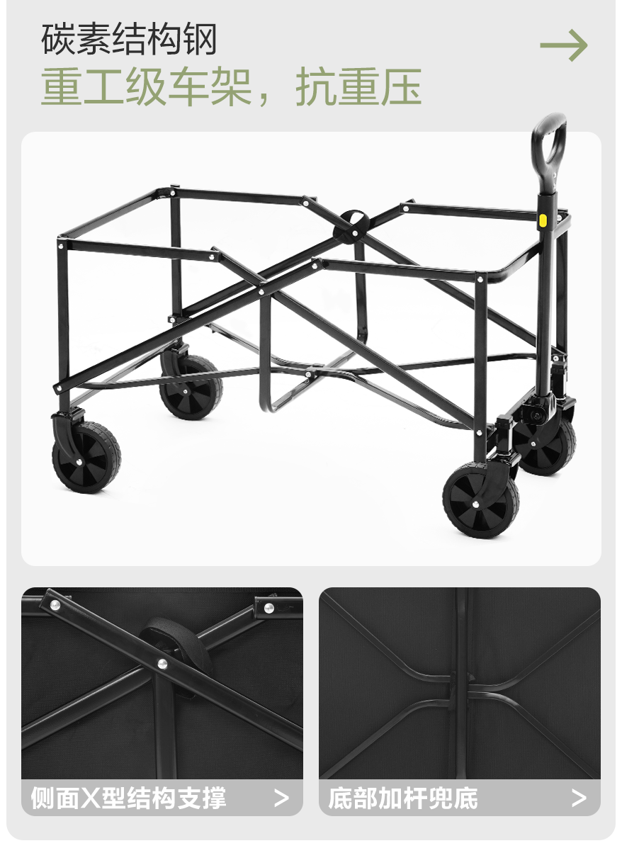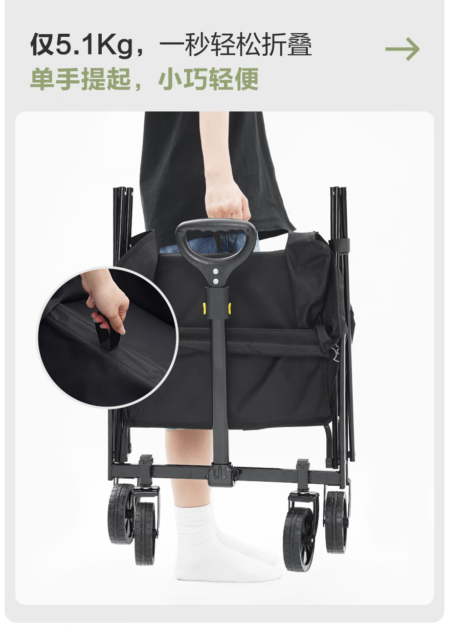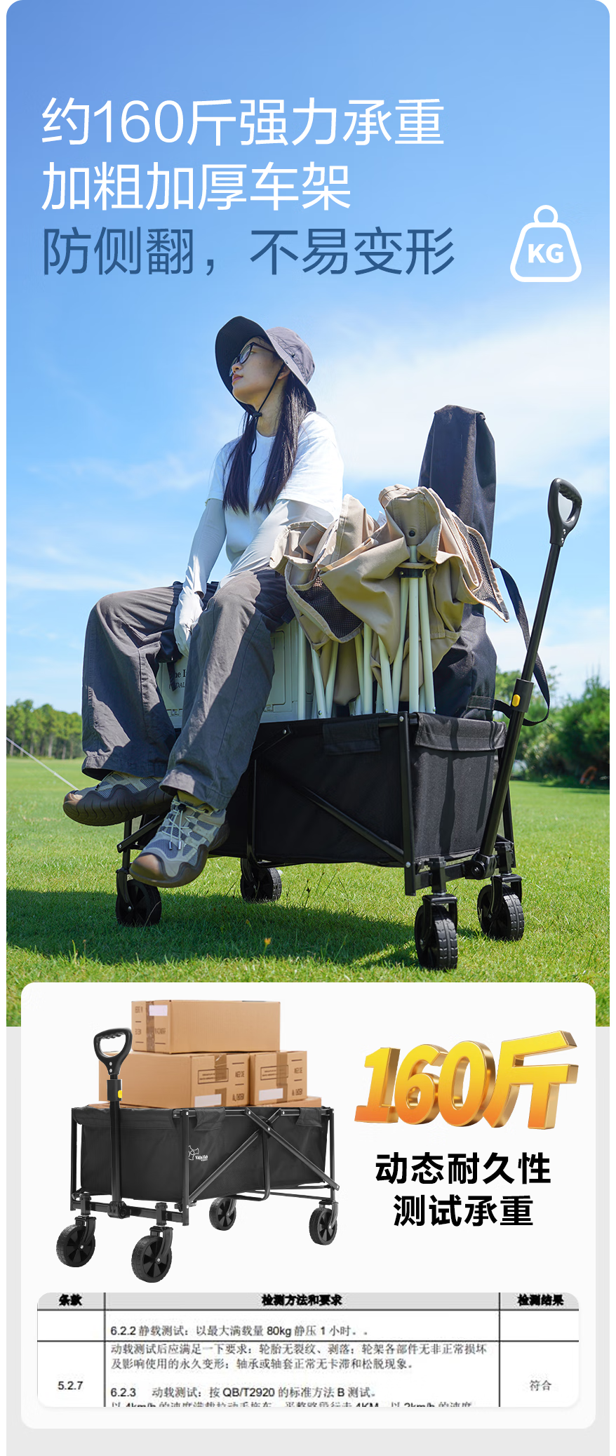为了露营特意买的,东西太多了,不好拿。小车很好推很顺滑,转方向灵活。质量很好,承重能力强,能装很多东西,不错的小帮手。