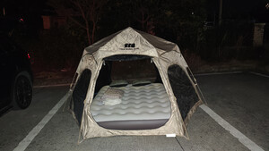 买这个帐篷⛺目前用过两次。买了个套餐,包含帐篷,防潮垫和床垫。帐篷挺厚实的,防风效果不错,防雨效果没试过。感觉床垫挺鸡肋的,首先特别厚重,携带不方便,二是有很重的味道,闻着不舒服,三是电动充气泵把电用完也充不满气,用嘴吹很累,如果重新买我肯定不买这个床垫了,还很贵。帐篷还是不错的,比四角帐篷大很多,睡两个人是绰绰有余,也挺结实的。