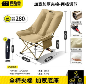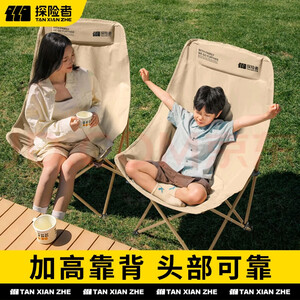 探险者户外折叠椅月亮椅便携式露营椅子钓鱼椅高靠背加厚躺椅家用小凳子 卡其高靠背椅*2+120蛋卷桌【一桌两椅】