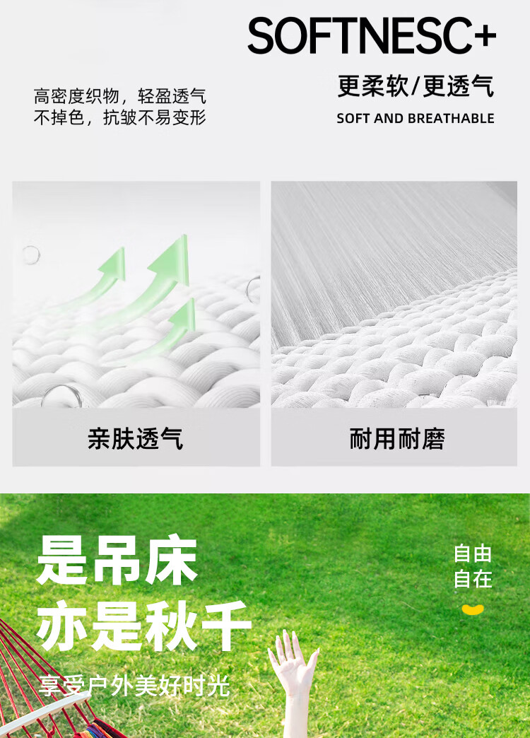 家里孩子用着不错,周末找两棵树就能系起来,躺上去不错,结实耐用。购物体验超级棒!商品物美价廉,质量绝佳。物流高效,商家服务耐心,售后无忧。