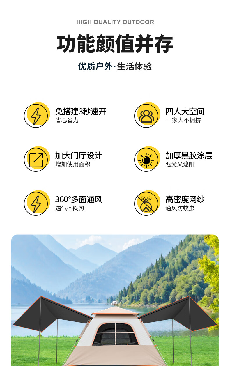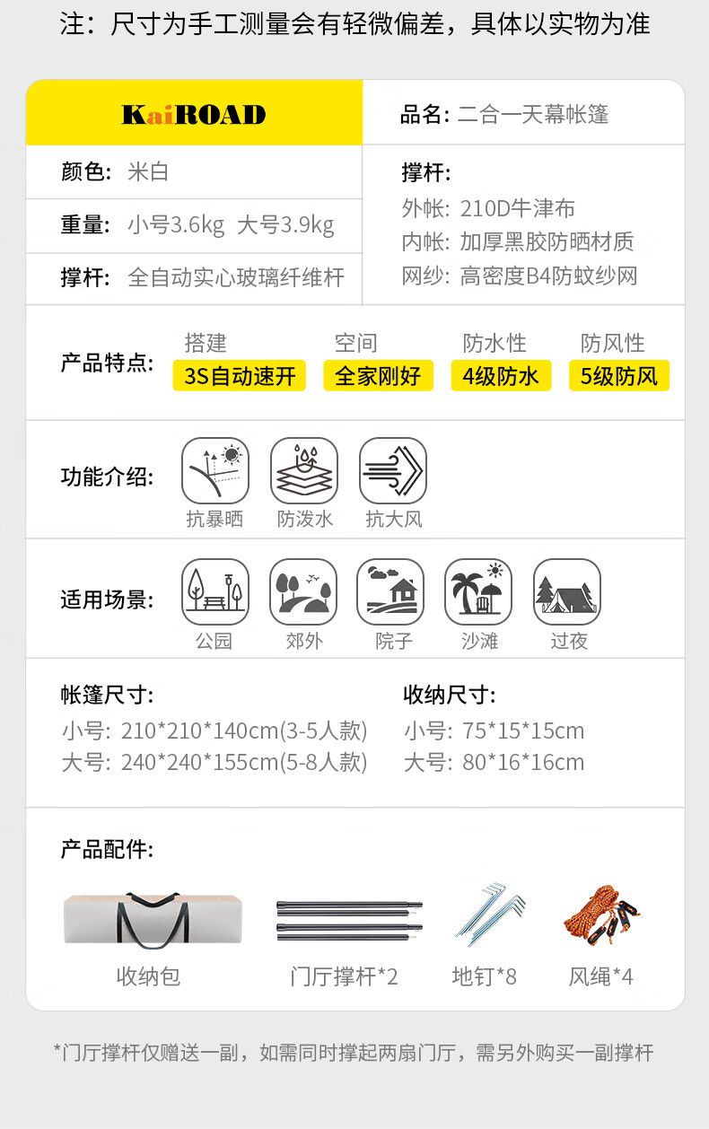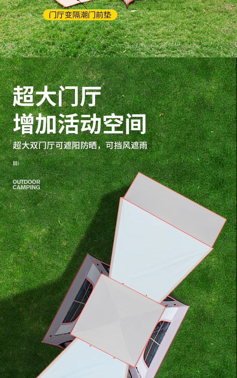 有天幕,十字窗户,外观是我想要的!如果天幕既能二合一又可以拆分,单独使用就更好了。做工质量蛮好,空间很大,收纳方便,小配件送的很充足。黑胶的说防晒效果好,防水如何,因还没使用,待实践验证后再追评。总体满意!!