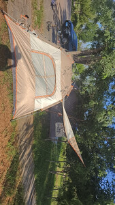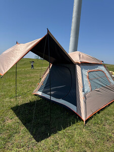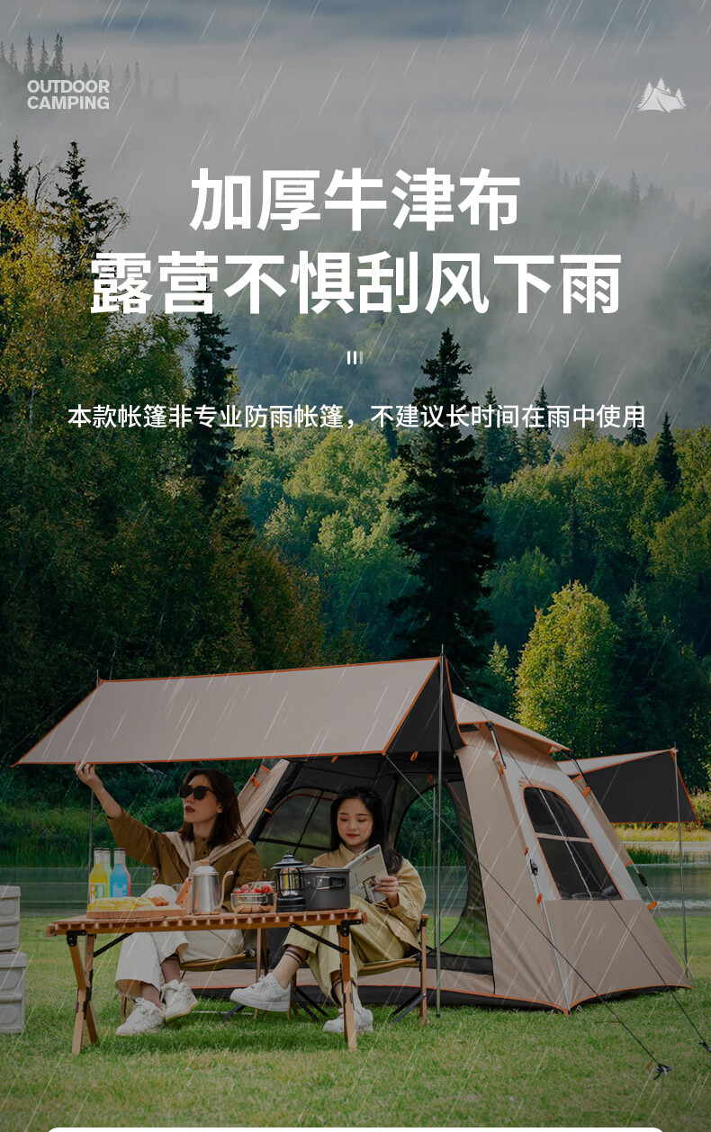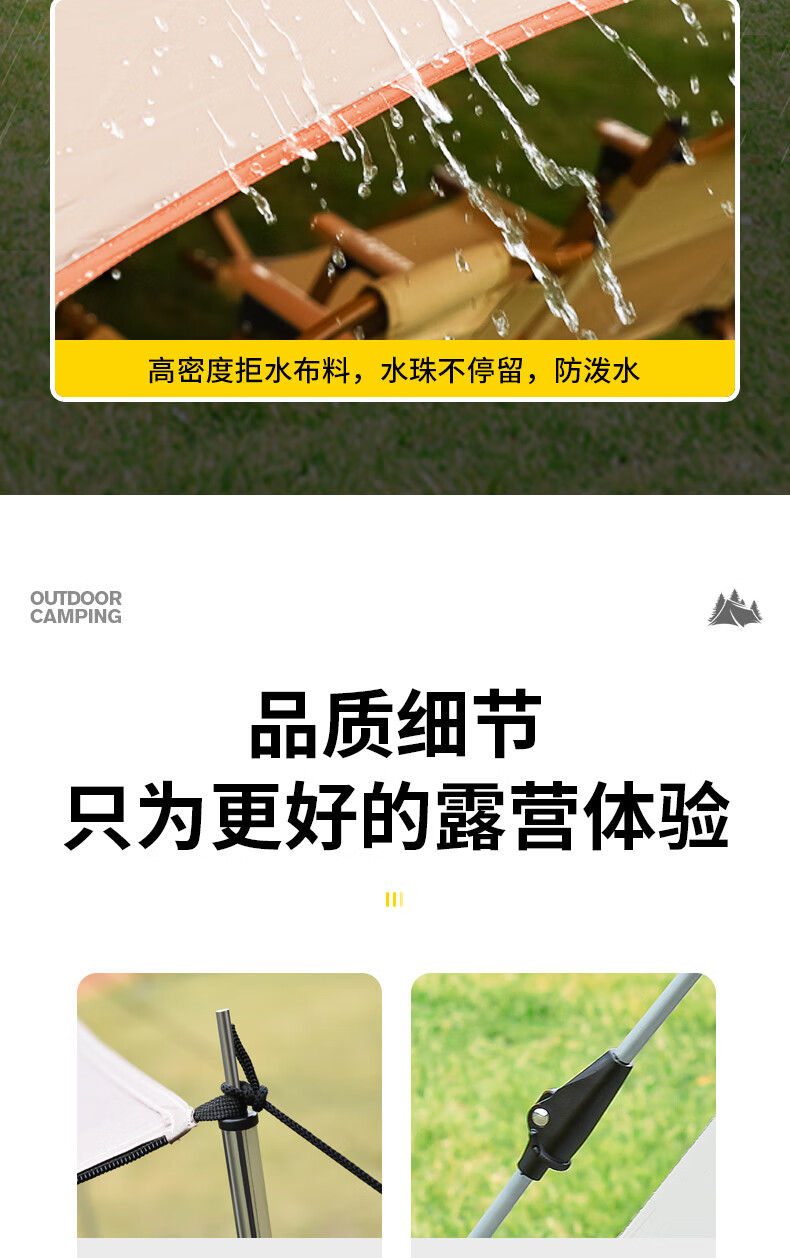 用过后真实评价。首先骨架四条腿遇偏大风会在链接处自动折弯。严重不防水,遇上一次中雨,以前的骆驼牌的啥事没有,这款根本顶不住。链接的两个小天幕就是鸡肋,安装受限制很不方便,没有拉链还拆不下来。帐篷的黑胶很薄多处透光,骨架很软,,平时哄孩子玩行,露营严重不推荐。以上是我用了5次以上的真实感觉。大家斟酌!对了通风很好!附上全方位照片。