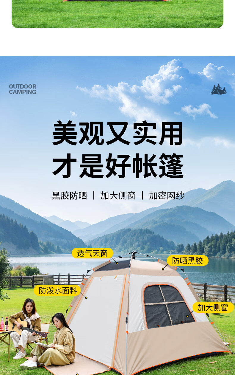 快递速度快,账篷配件齐全,简单易操作,非常适合户外露营使用,造型美观,防水效果良好, 容纳人数比较多,透气效果良好,好收纳,易于携带。有小瑕疵,给了点赔偿,找裁缝缝了一下