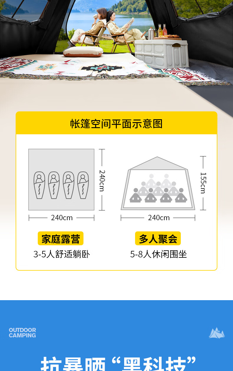 凯路德(KAIROAD)户外露营帐篷天幕二合一黑胶遮阳防晒野外过夜自动速开全套装备 【野餐套餐】3-5人帐篷+天幕