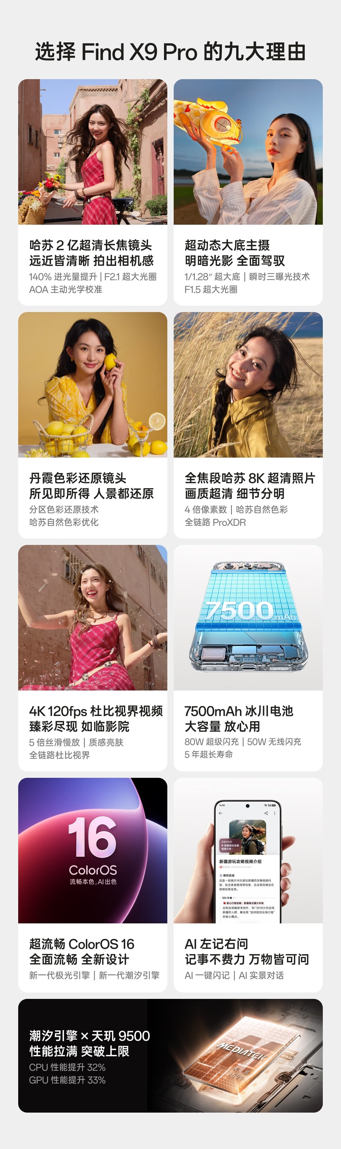OPPO Find X9 Pro上手超惊艳,7500mAh大电池续航超顶,中重度使用一天剩余电量充足,出差通勤完全无续航焦虑。哈苏2亿像素长焦解析力拉满,放大细节清晰细腻,人像虚化自然、肤色还原真实,暗光拍摄也能留住丰富质感。天玑9500搭配潮汐引擎,玩主流游戏满帧流畅不卡顿,机身绒砂工艺手感亲肤不沾指纹,窄边直屏护眼舒适,日常用机丝滑又省心,旗舰体验拉满超值得入手!