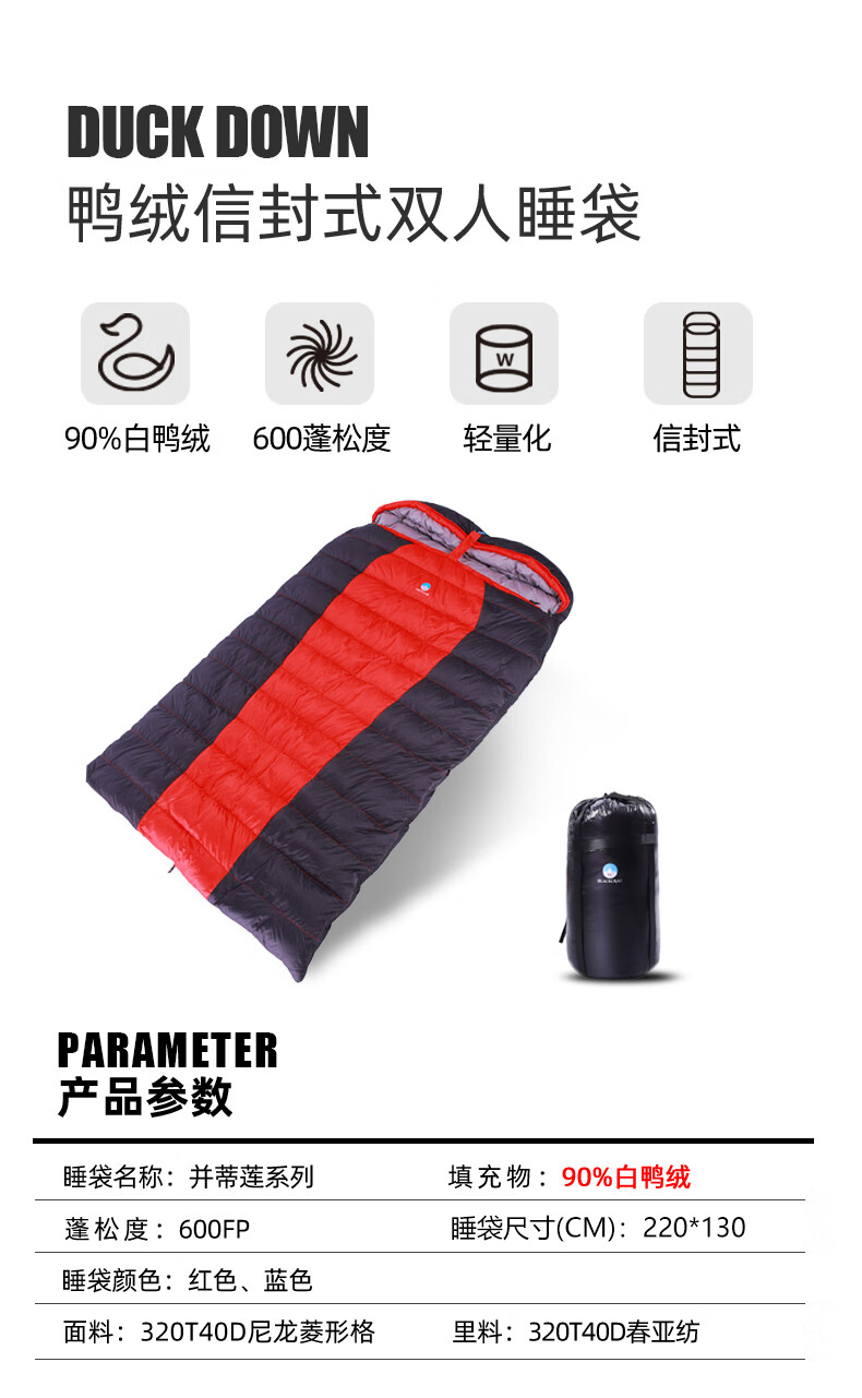 黑岩(BlackCrag) 并蒂莲系列 户外居家 双人信封羽绒 双人羽绒被600蓬白鸭绒 蓝色2500克充绒量