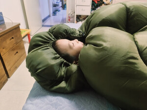 可以是一个睡袋,也可以铺平开,拉开拉链平铺。外层是防水的孩子的湿手摸上去是形成的水珠,不会被吸收掉。包裹的很严实,也可以选择只露一个脑袋。配的有收纳袋,不占空间。