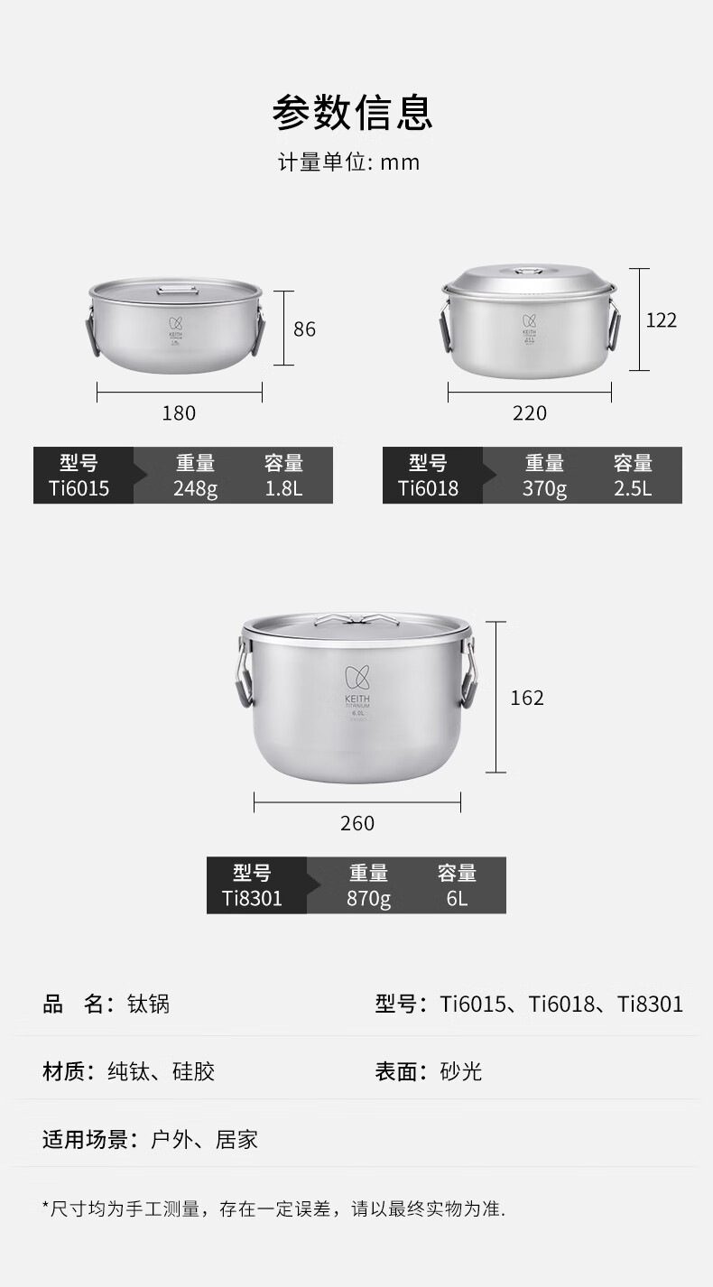 双11狠狠心下手了,换掉所有硬质氧化铝,这个锅的质量一流,大小够5人去火锅,钛稳定,不怕有渗出,长时间火锅很放心 适用场景:火锅,炖肉,炖菜都OK,非常坚固 重量大小:比较轻,携带方便