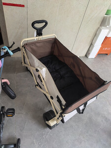 这车挺重的,挺好,就是感觉价钱有点贵,轮子挺大,能装东西。能放小孩,质量感觉也行,收起来也方便,收完也不算小巧,主要挺重,后面少了一个杆,容易扎到人