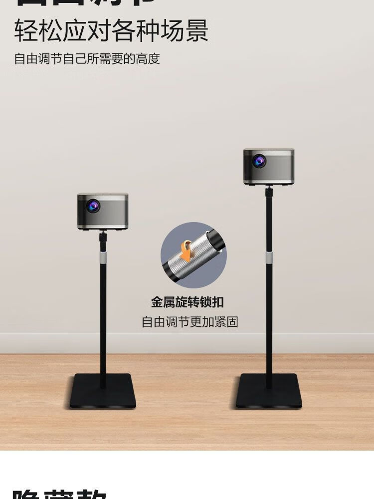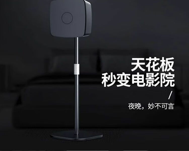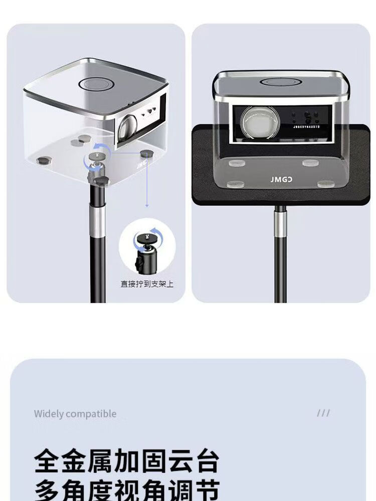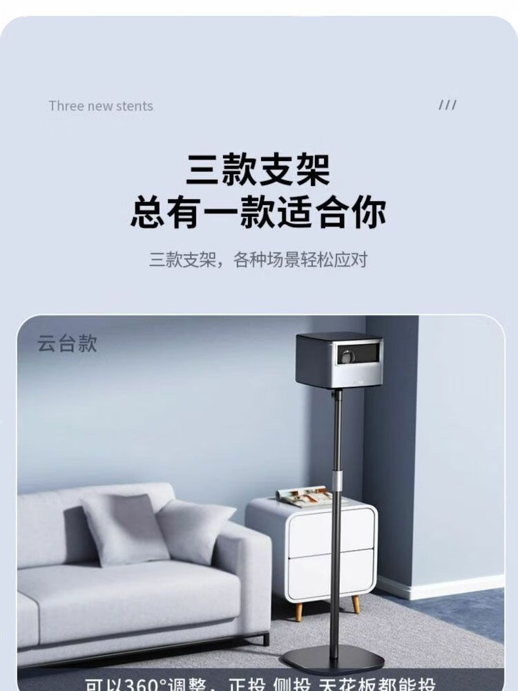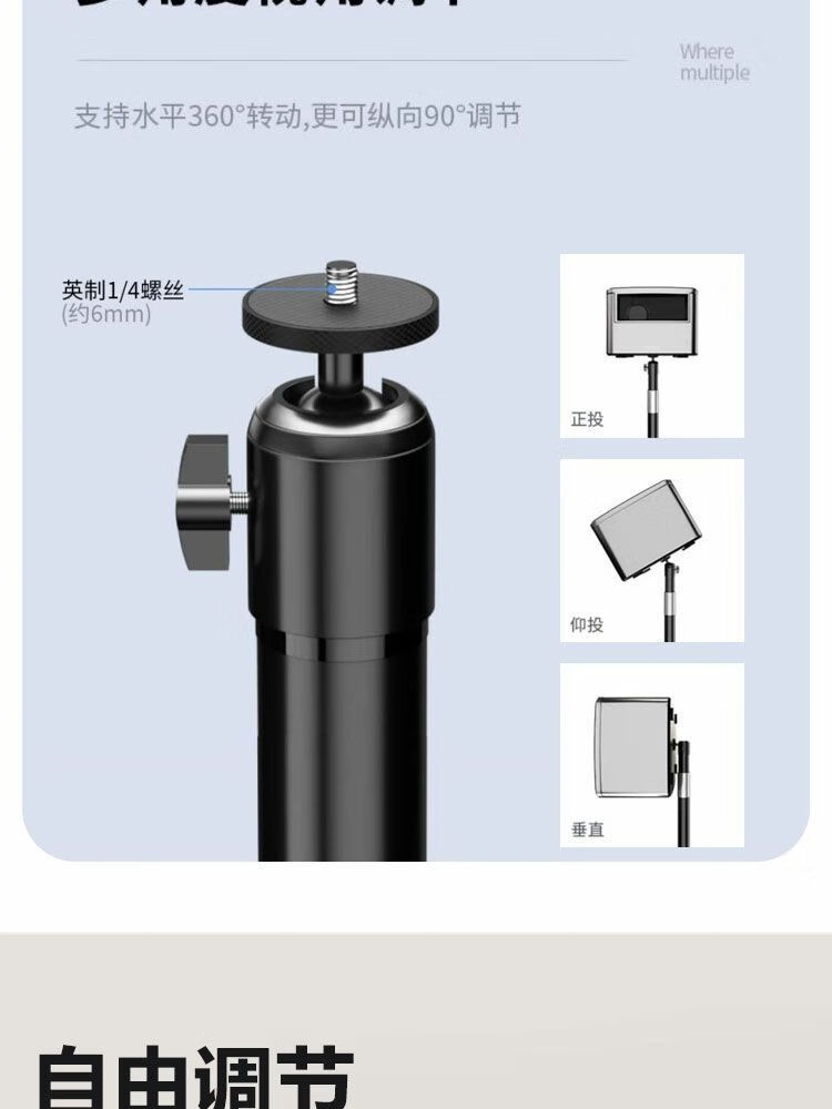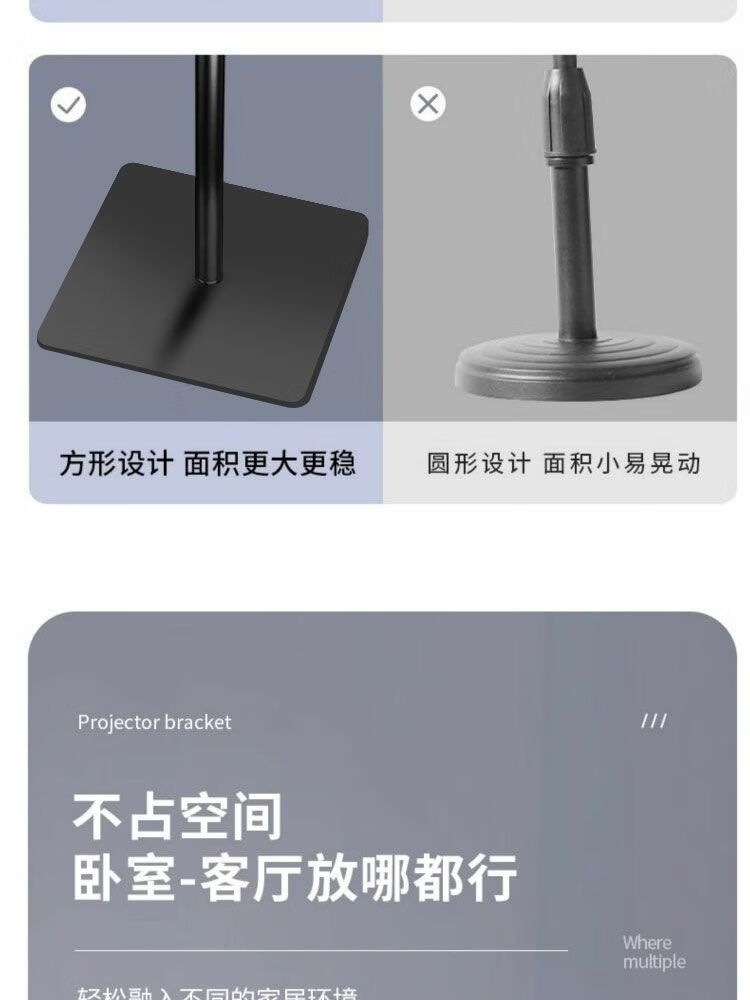 支撑杆是圆的,具有一定厚度,所以不能实现靠墙,云台上的圆球只能和地面垂直,投影仪也只能和地面平行,不能仰头或者低头,否则圆球卡不稳,会因为投影仪的重力向下偏移!没有达到预期效果