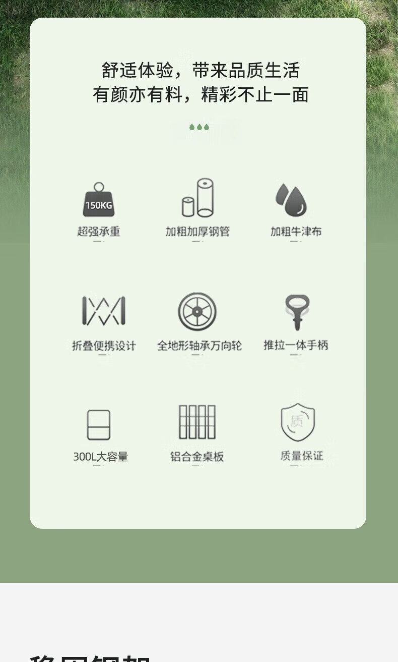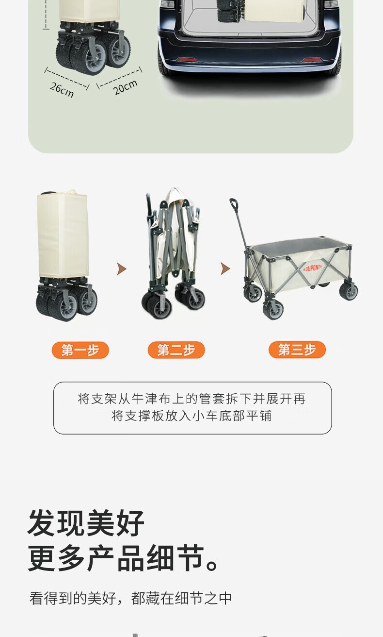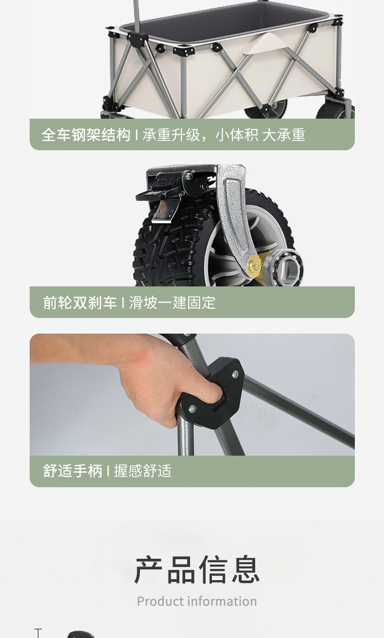这款营地车质量不错,使用了几次,特别能装,而且承重能力强,很好收纳,不占地方。户外推拉容易,不过往前推的时候可能会有蛇形走位。整体性价比很高,推荐使用。