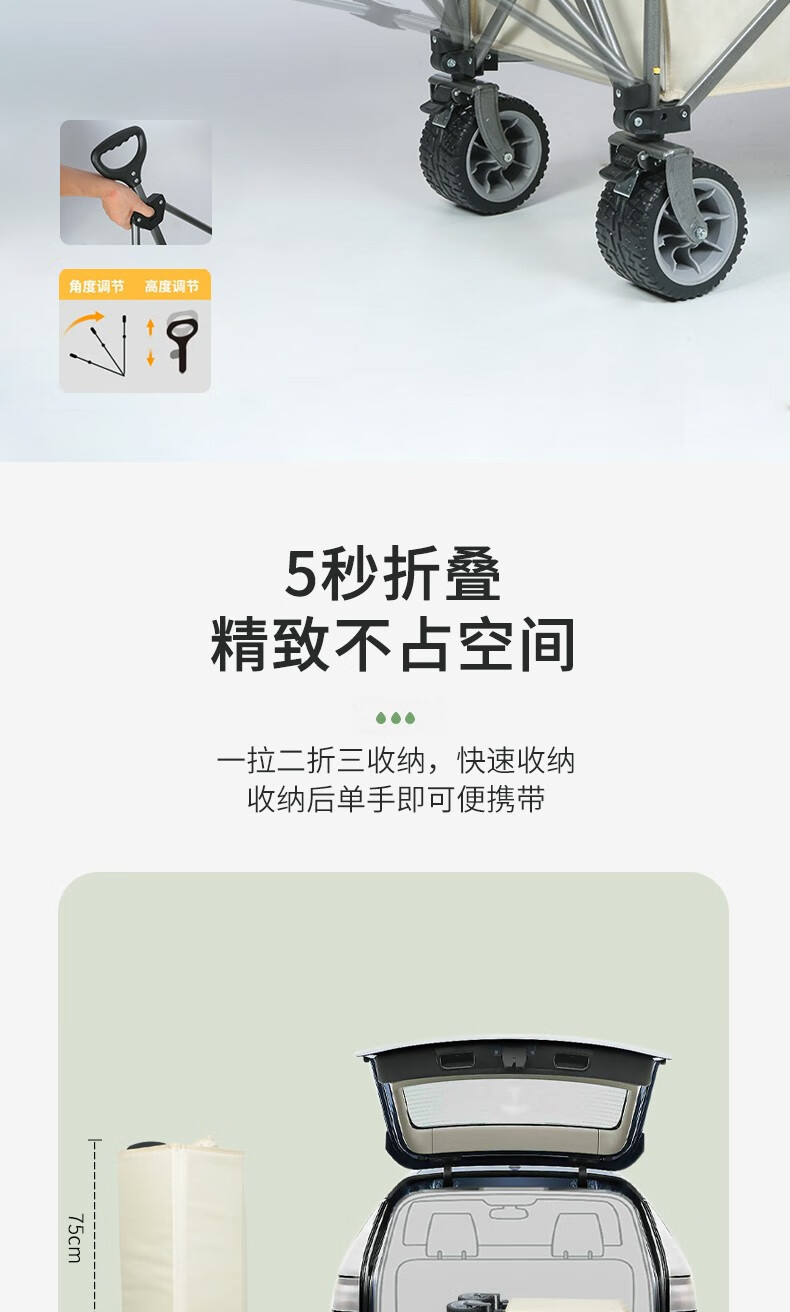 这款营地车总体体验下来非常不错,和之前买过的那种折叠车相比,要好太多了收纳非常方便,一拉就收起来了,挡板还可以放收纳扣起来,还能放垫板不错的,轮子还能拆卸,就是重量有点重,质量,性价比没的说,200斤完全没问题。最近比较忙买回来都用来取快递了。后面假期再去户外试试。