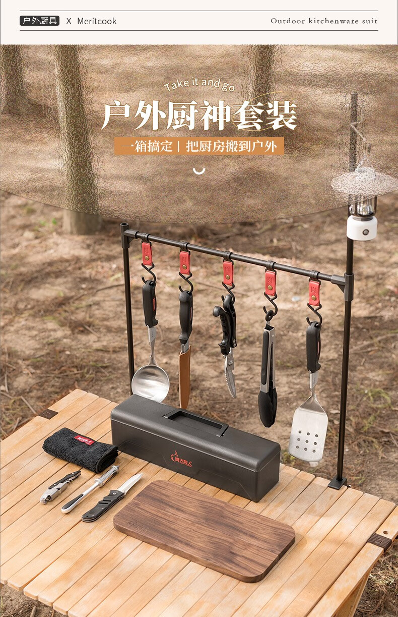 meritcook户外厨具套装折叠便携露营野炊11件套食材剪食物夹砧板汤勺套装 便携式户外【厨具套装】