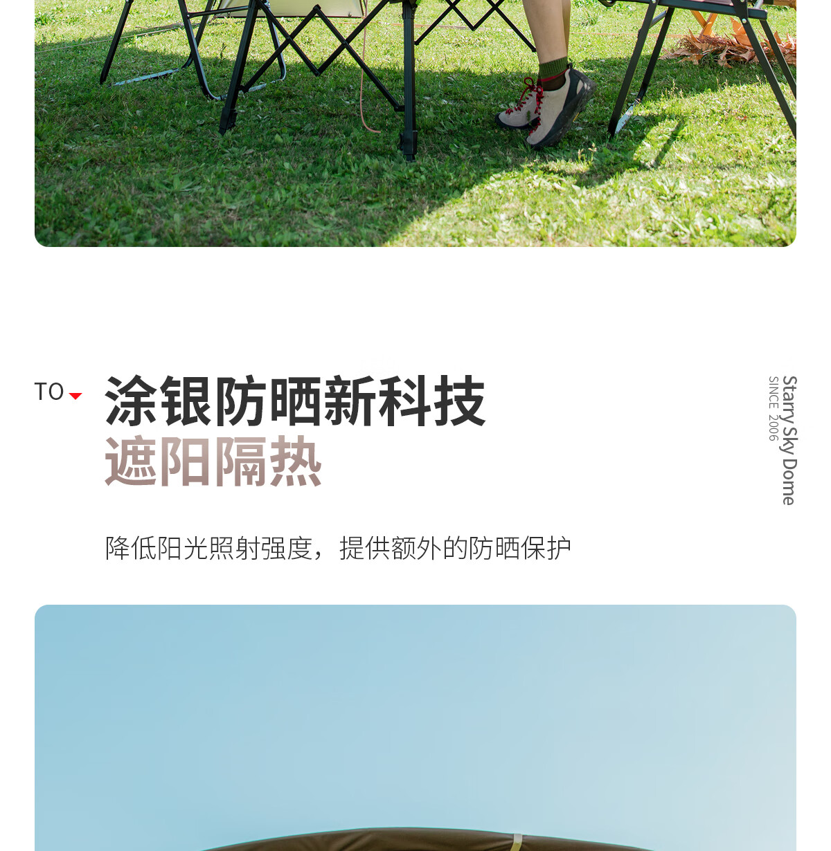 质量很不错,黑胶涂的非常均匀,没有看到有瑕疵的地方,遮阳效果也很好,中心顶部的挂钩可以挂各种露营灯,非常好