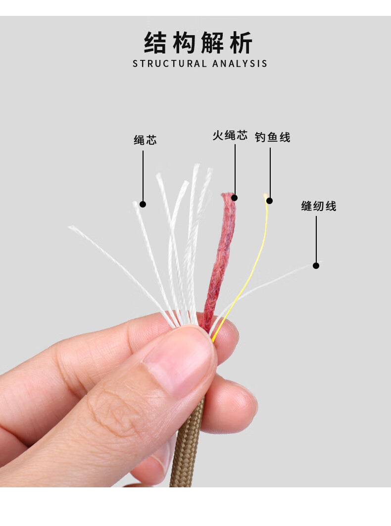 买来自己编相机腕带的,重庆话来说就是这线确实经得bei,7根芯+1根渔线+1根火绳(本人没用过不知道咋用)+1根裁缝线,芯对没错的。 多余的还能用来天楼拉线晒衣服,不过野外涉及绳降的话,还是老式菌用或者凯夫拉的吧,毕竟生命只有一次没必要测试。