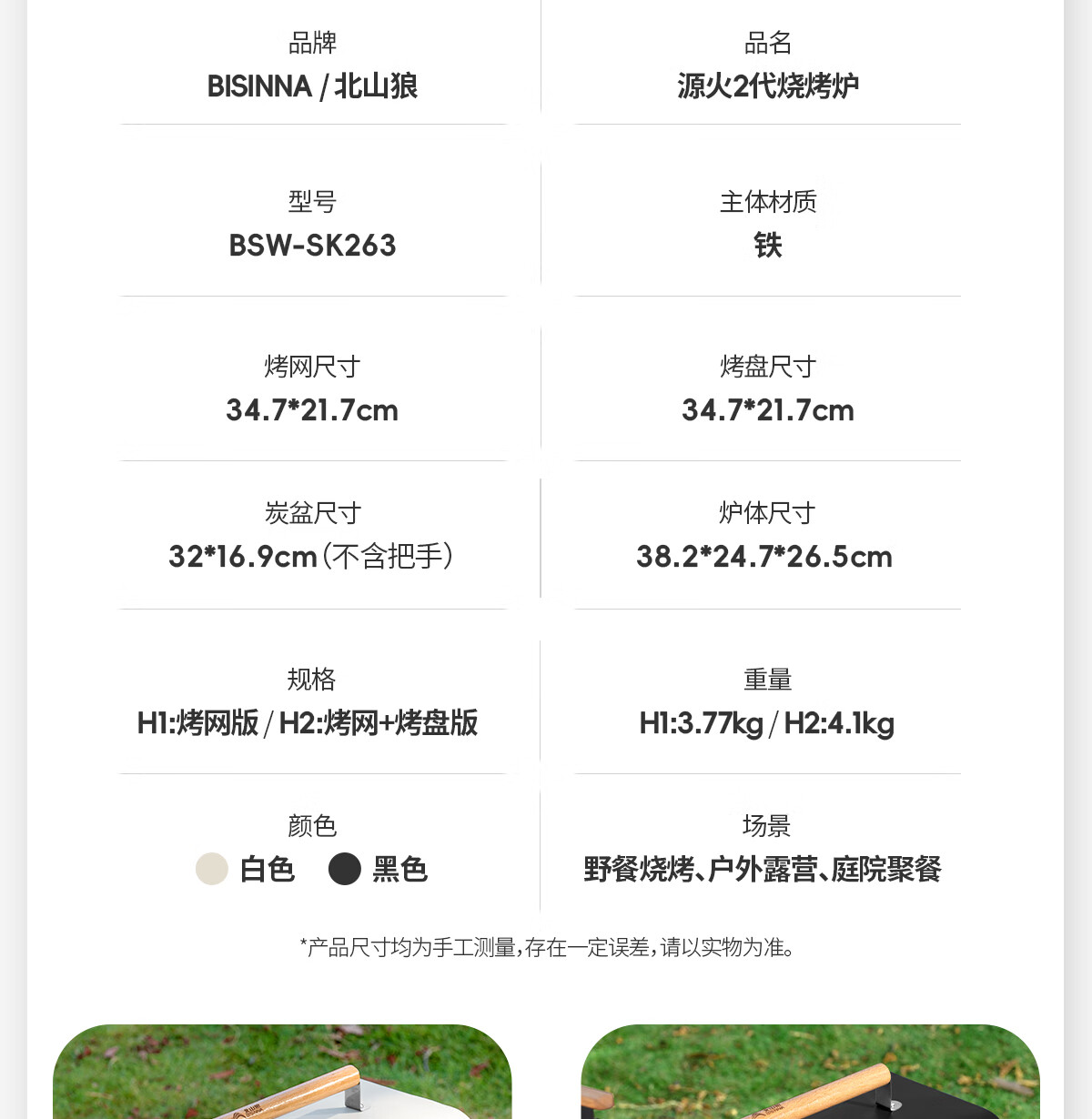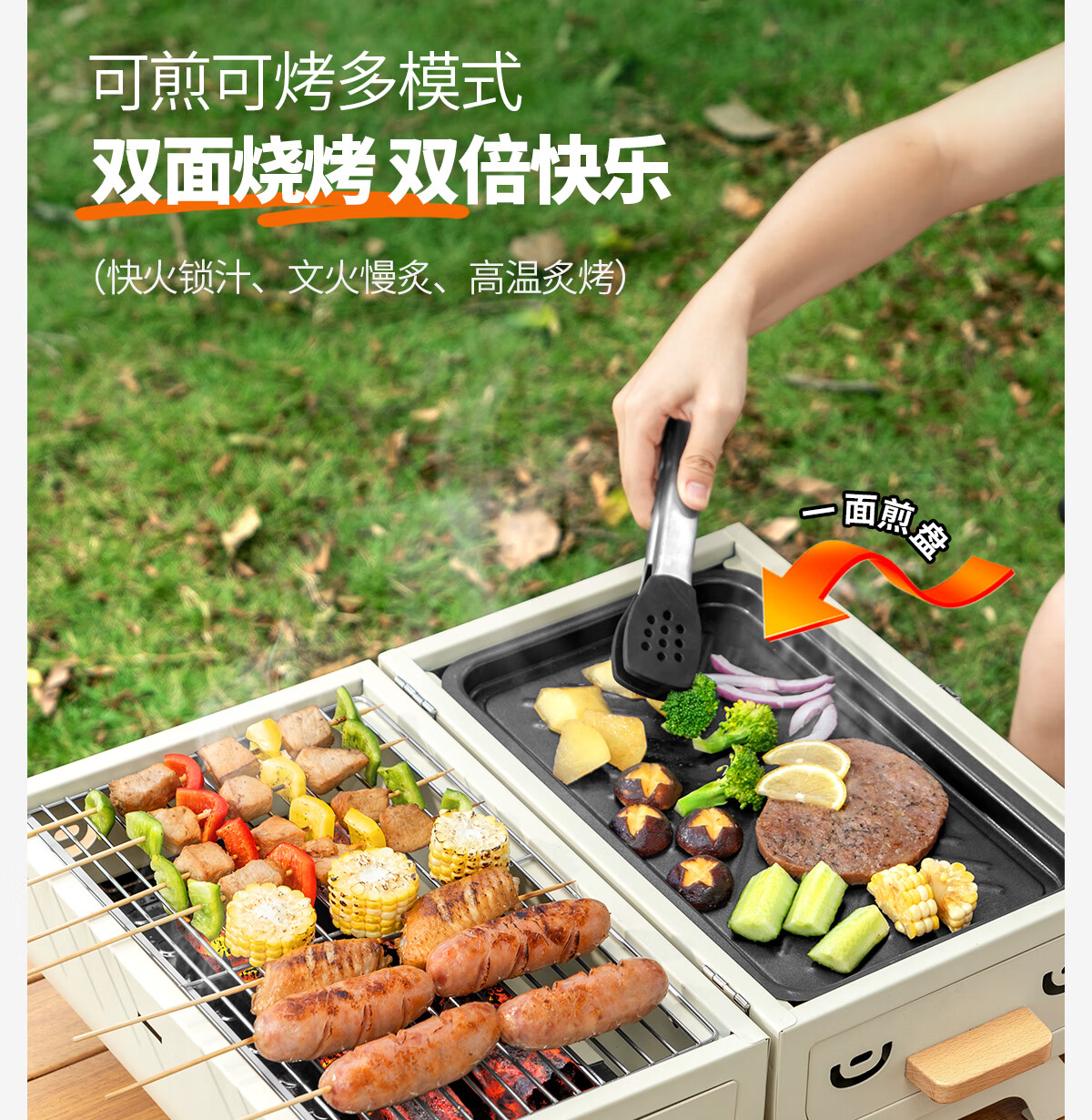 北山狼户外烧烤炉双面碳烤炉 家用庭院便携煎烤两用一体带烤盘折叠烤炉 白色H2+5斤炭+1卷速燃炭