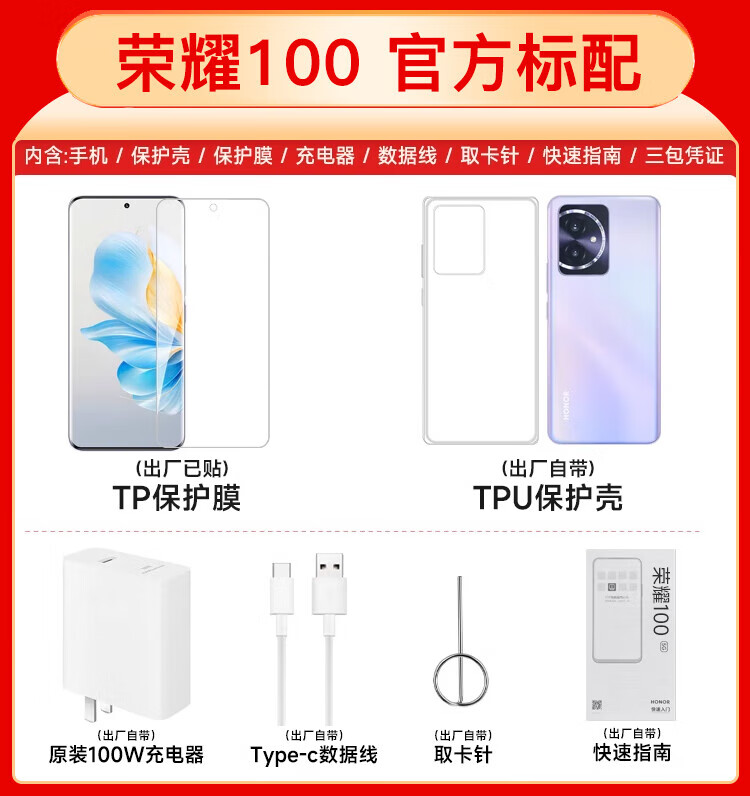 手机(内置电池)*1 充电器*1 数据线*1 保护壳*1 快速指南*1 取卡针*1 保护膜(出厂贴在手机上)*1 三包凭证*1 会员权益礼包*1