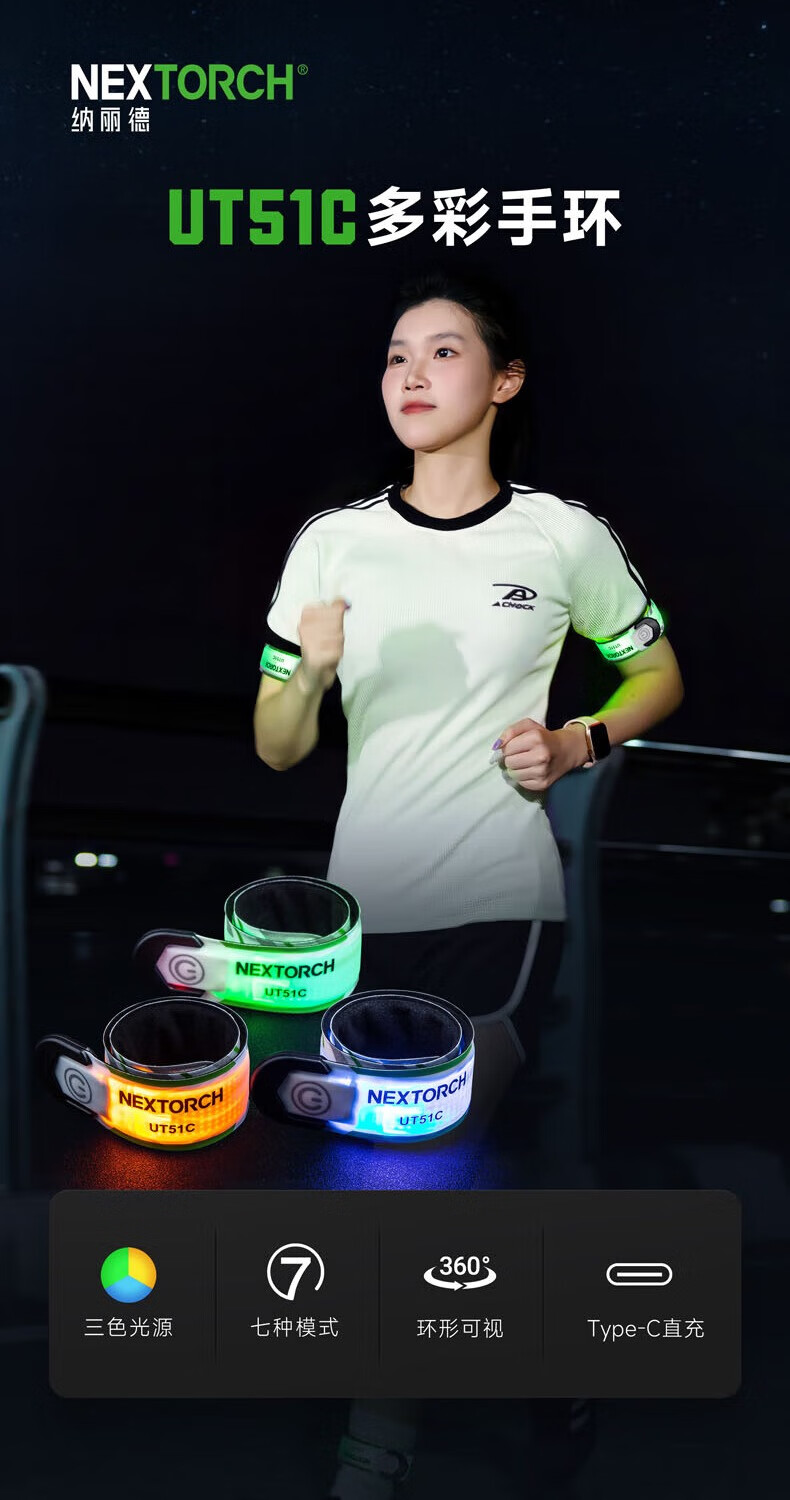 纳丽德(NEXTORCH)UT51C蓝绿橙三光源发光手环夜跑夜骑反光带安全警示信号灯可充电 UT51C手环(蓝绿橙三光源)