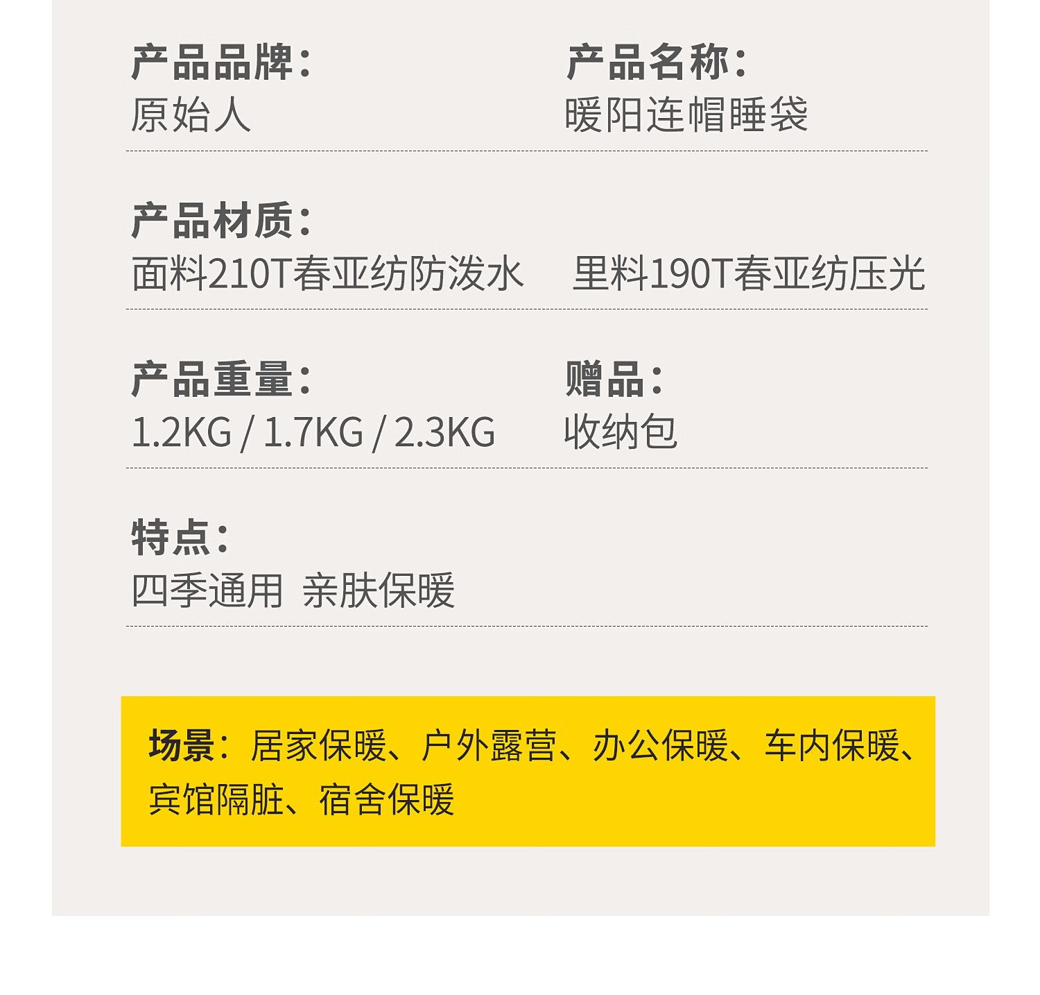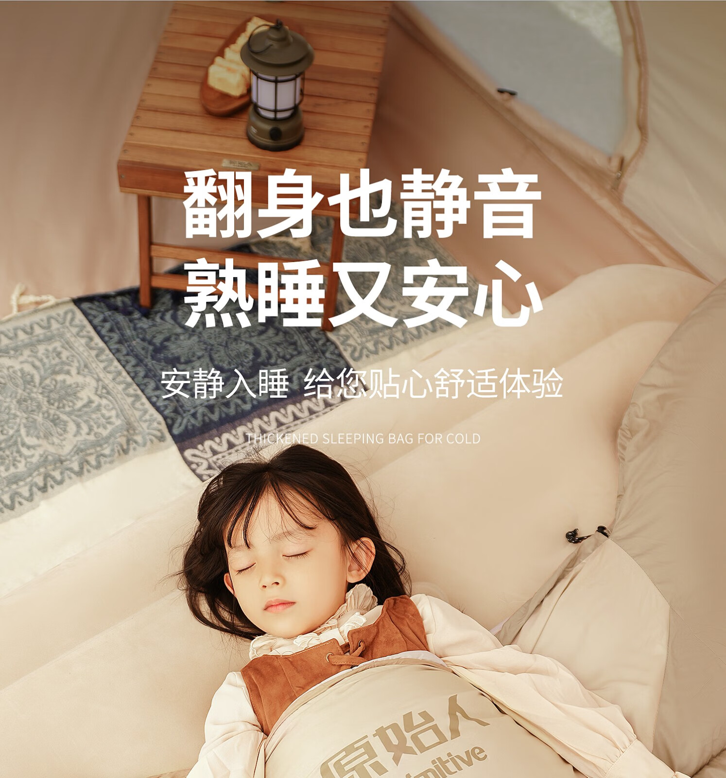这款原始人睡袋真的让我惊喜连连!首先,它的鹅绒填充物非常保暖,即使在寒冷的夜晚也能保持温暖。其次是面料,柔软亲肤,没有任何刺激感,让我睡觉时感觉非常舒适。而且设计也很贴心,厚实的拉链和拉链保护层避免了摩擦噪音,不会影响睡眠。最后,收纳也非常方便,一折就能放进背包里,体积小巧不占地方。总的来说,我强烈推荐给喜欢户外运动的朋友们,这是一款绝对值得投资的好产品。