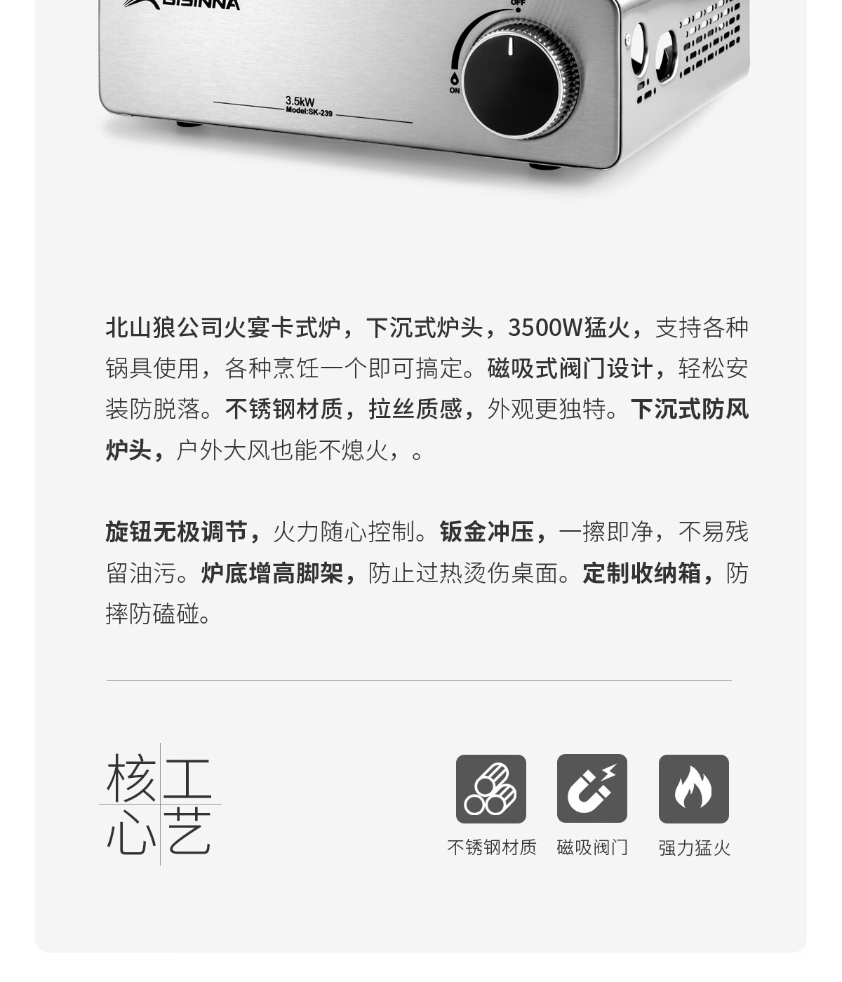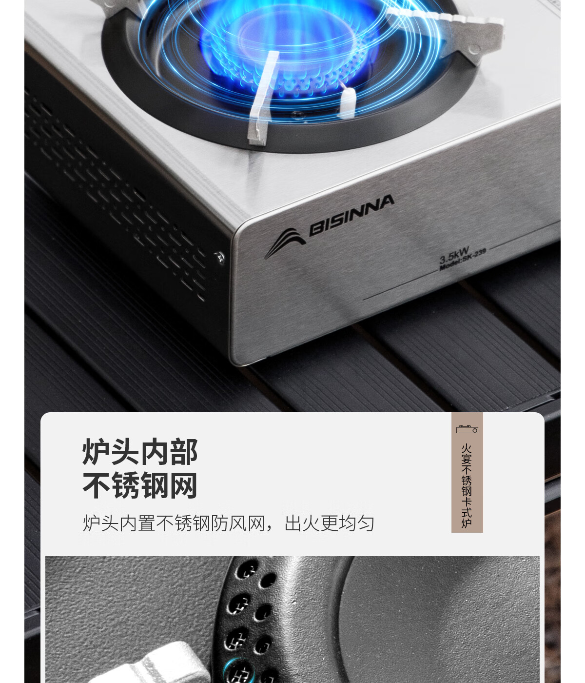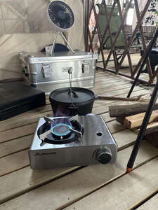 最近迷上户外烧烤,这卡式炉帮大忙了。5800w 大火力迅速升温,不锈钢外壳坚固耐用,意外之喜是使用时完全不烫手