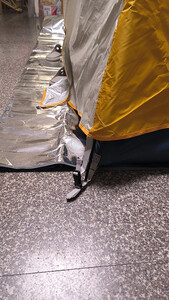 收到货打开之后发现面积非常大,已经远远超过自己可以在室内拍摄打卡的范围了。无奈外面一直阵雨不断,无法在户外大大方方的拍摄全景。 最开始购买这一款的时候,目标非常明确。使用一份钱,尽可能应对多种场景。 首先就是作为帐篷外面最底下的那一层保护层,同时由于是铝膜的原因,还可以有效隔湿。 其次还可作为帐篷内部,防潮垫最下面的那一层保护,这也是我买了两件的原因,我怕冷啊。 最后算是一个加分项吧。因为四个边角预留了加固的孔洞,可以作为小天幕,遮阳避雨。 希望等待天晴的时候,能够在户外使用起来,达到自己的预想目标。