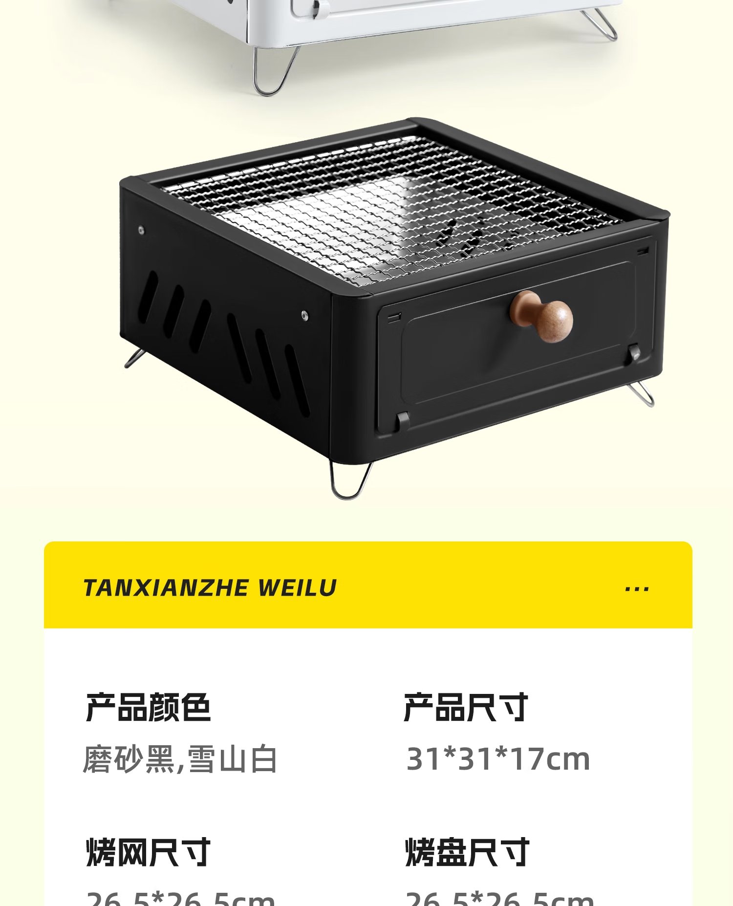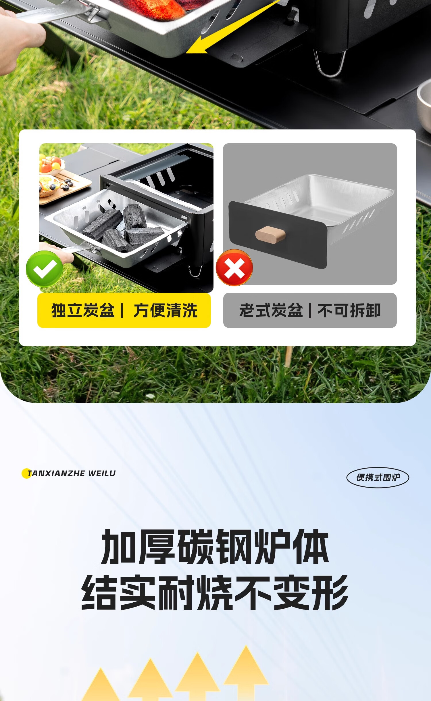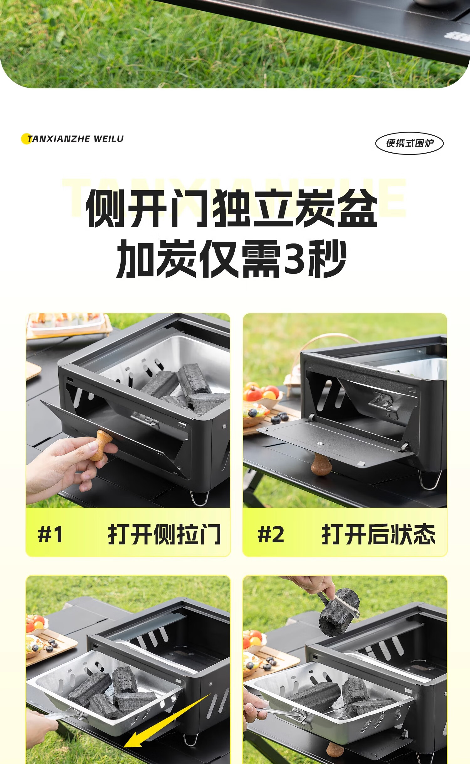 折叠方便,下面边上还设计了抽拉探槽的设计,碳快熄灭的时候可以直接拉出来更换,真的是非常方便了,除了物流慢了点,在这个购物过程中没有别的不好的地方。