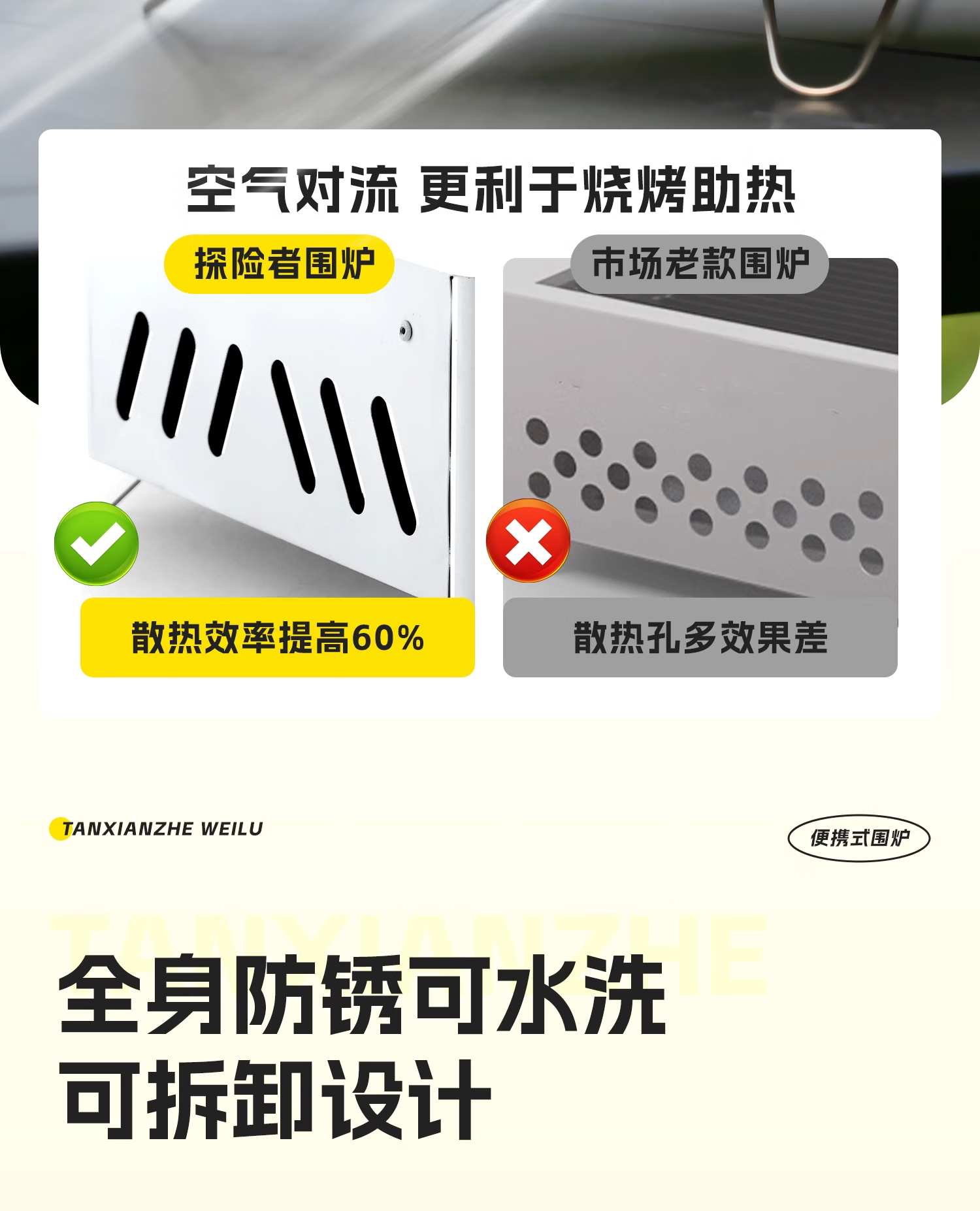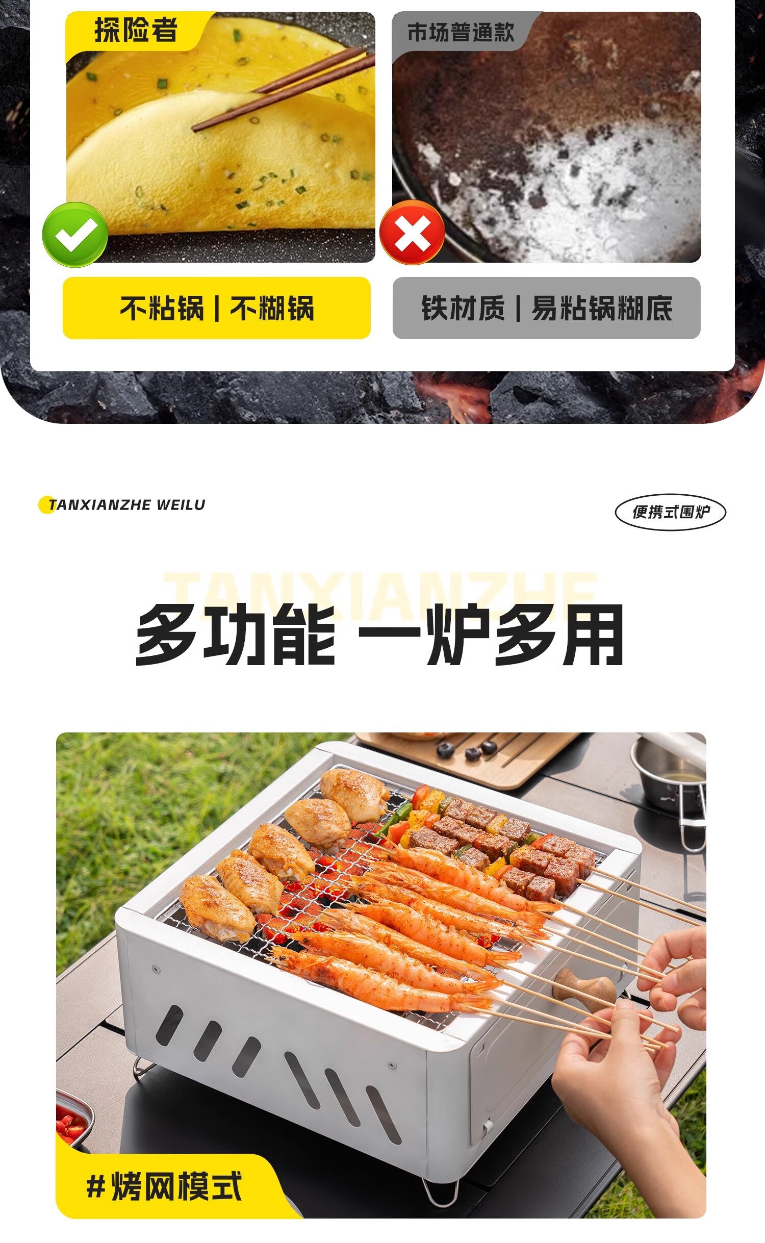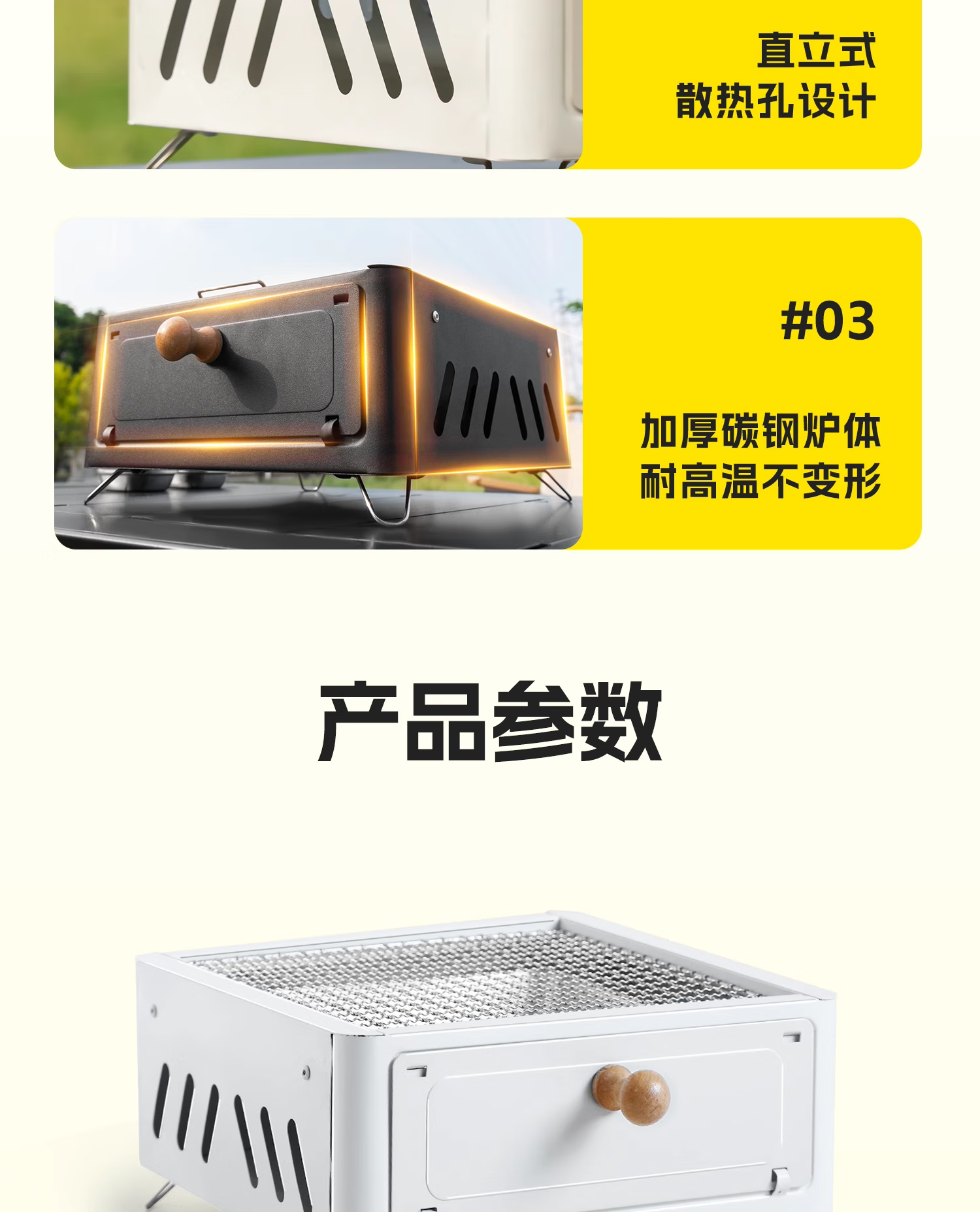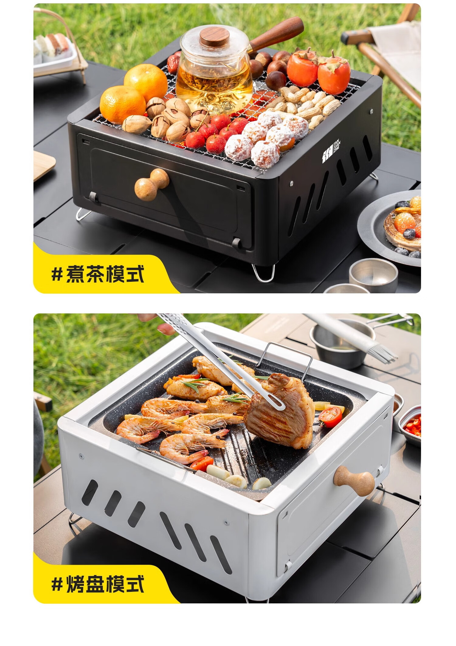折叠方便,下面边上还设计了抽拉探槽的设计,碳快熄灭的时候可以直接拉出来更换,真的是非常方便了,除了物流慢了点,在这个购物过程中没有别的不好的地方。