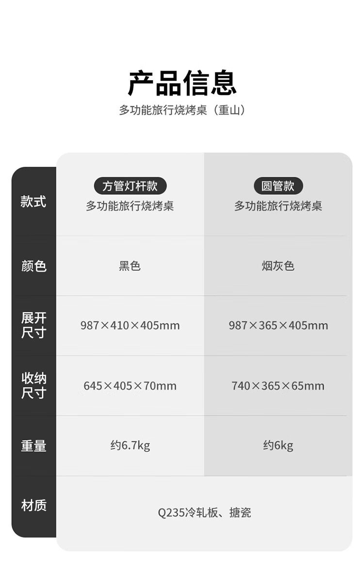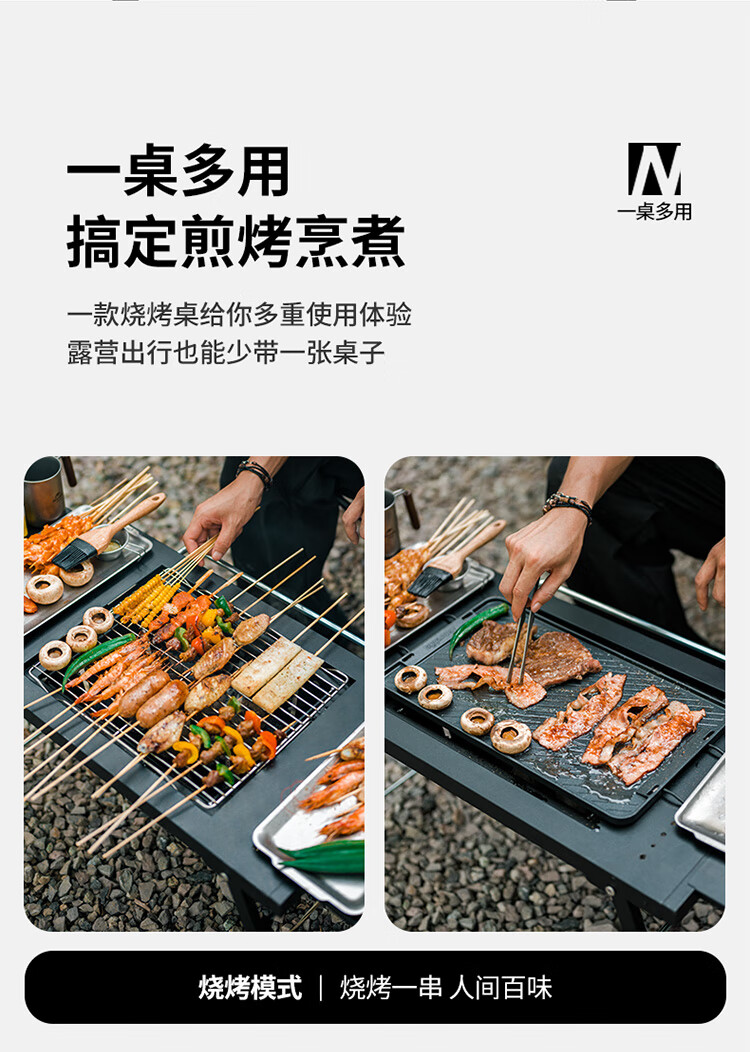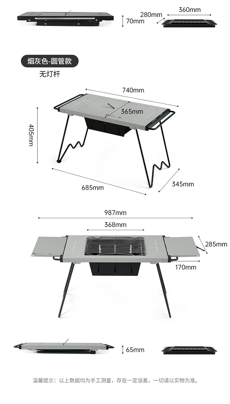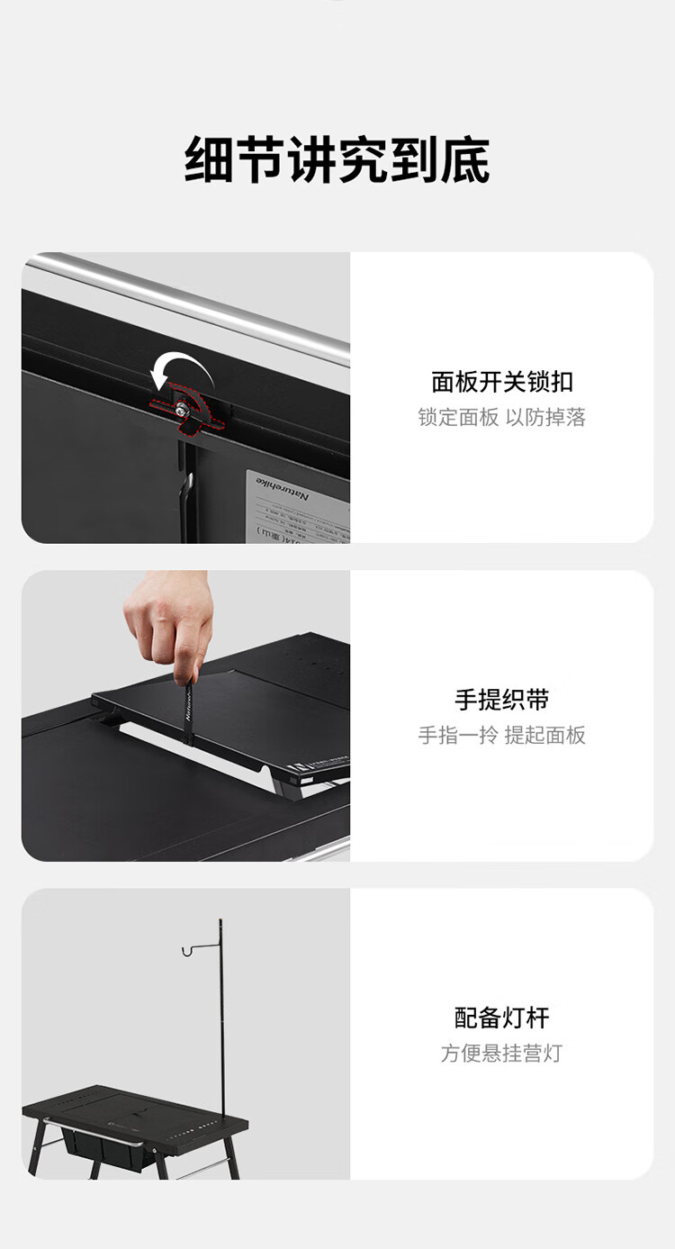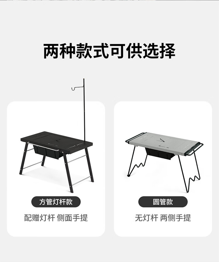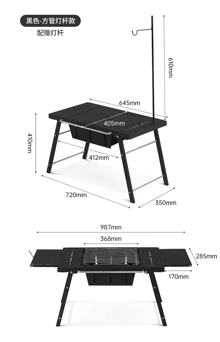 NatureHike挪客重山烧烤桌户外露营折叠桌野餐便携折叠烧烤架家用炭烤炉烤肉 黑色-方管灯杆款