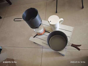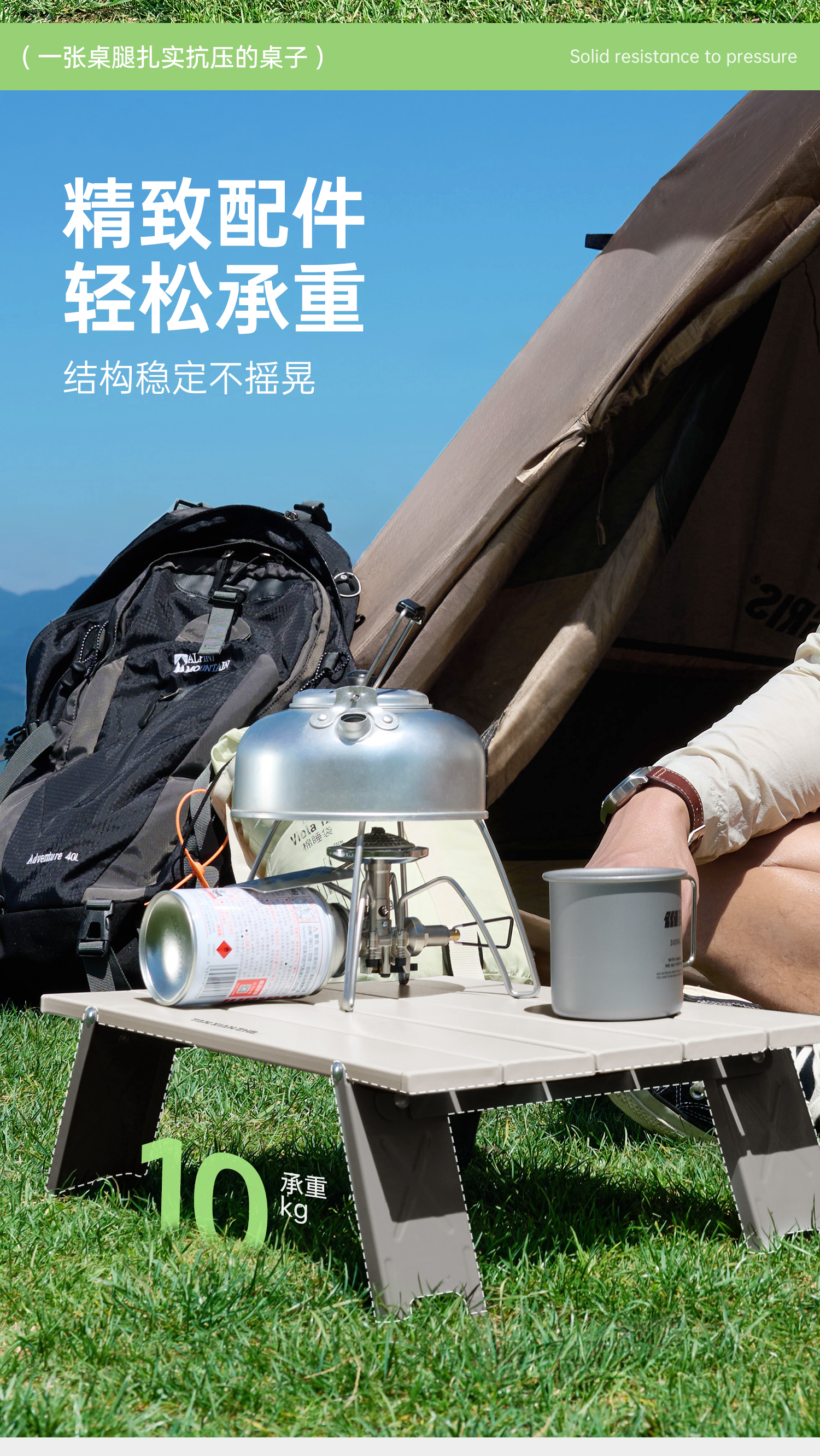 个头小小的,但也能放上一个登山炉,一个1.'升的锅,再加一个500毫升的杯子,足够了,不过展开后如何不放置在平地的话,桌面就会不够稳当,建议能加个固定桌面的小零件
