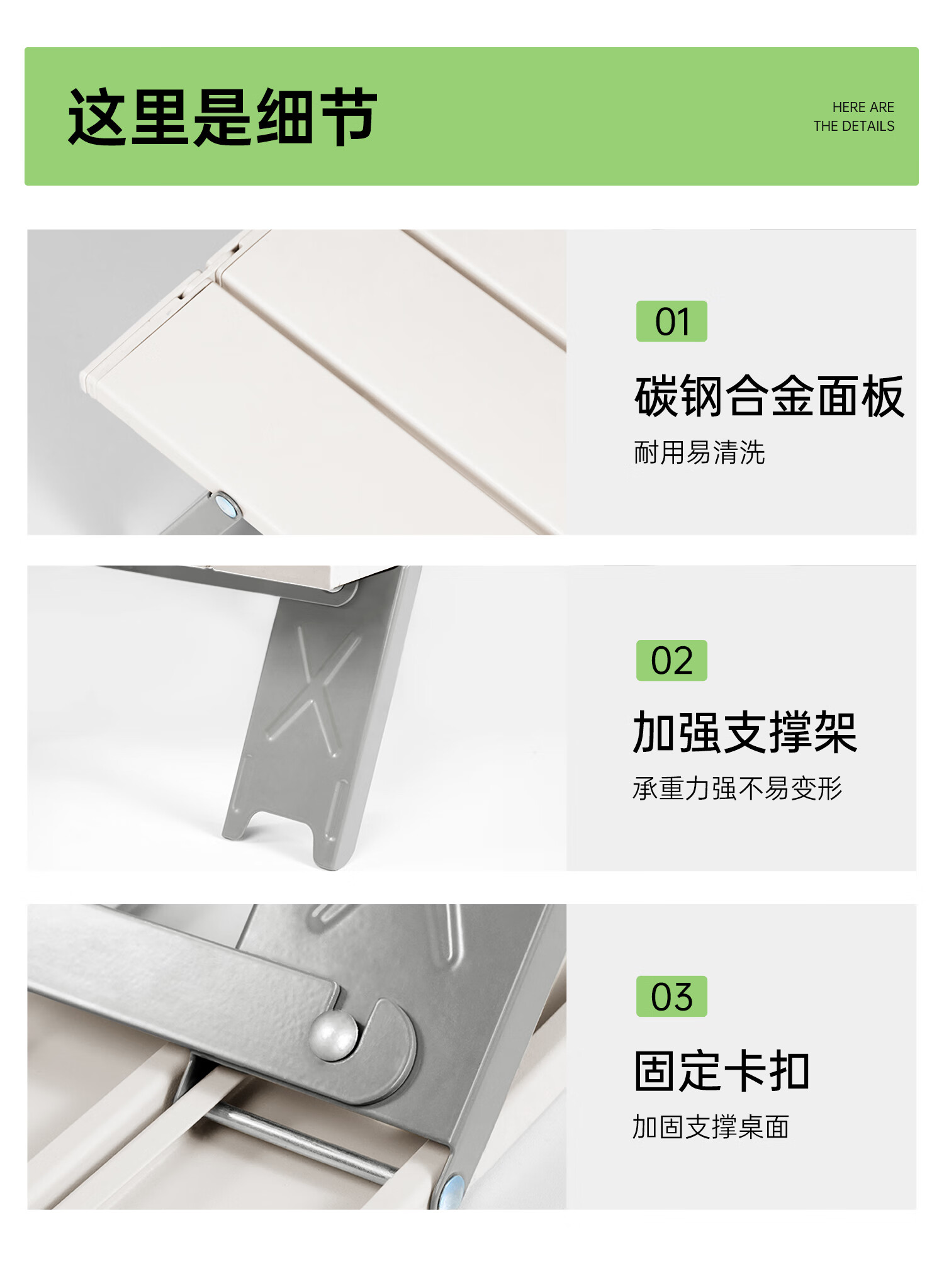 大小,高度都挺合适,收纳组装也很简单,收纳袋一装就能提走,也很方便,不占地方,放着很稳当,桌面也是很容易清洁的,不会生锈
