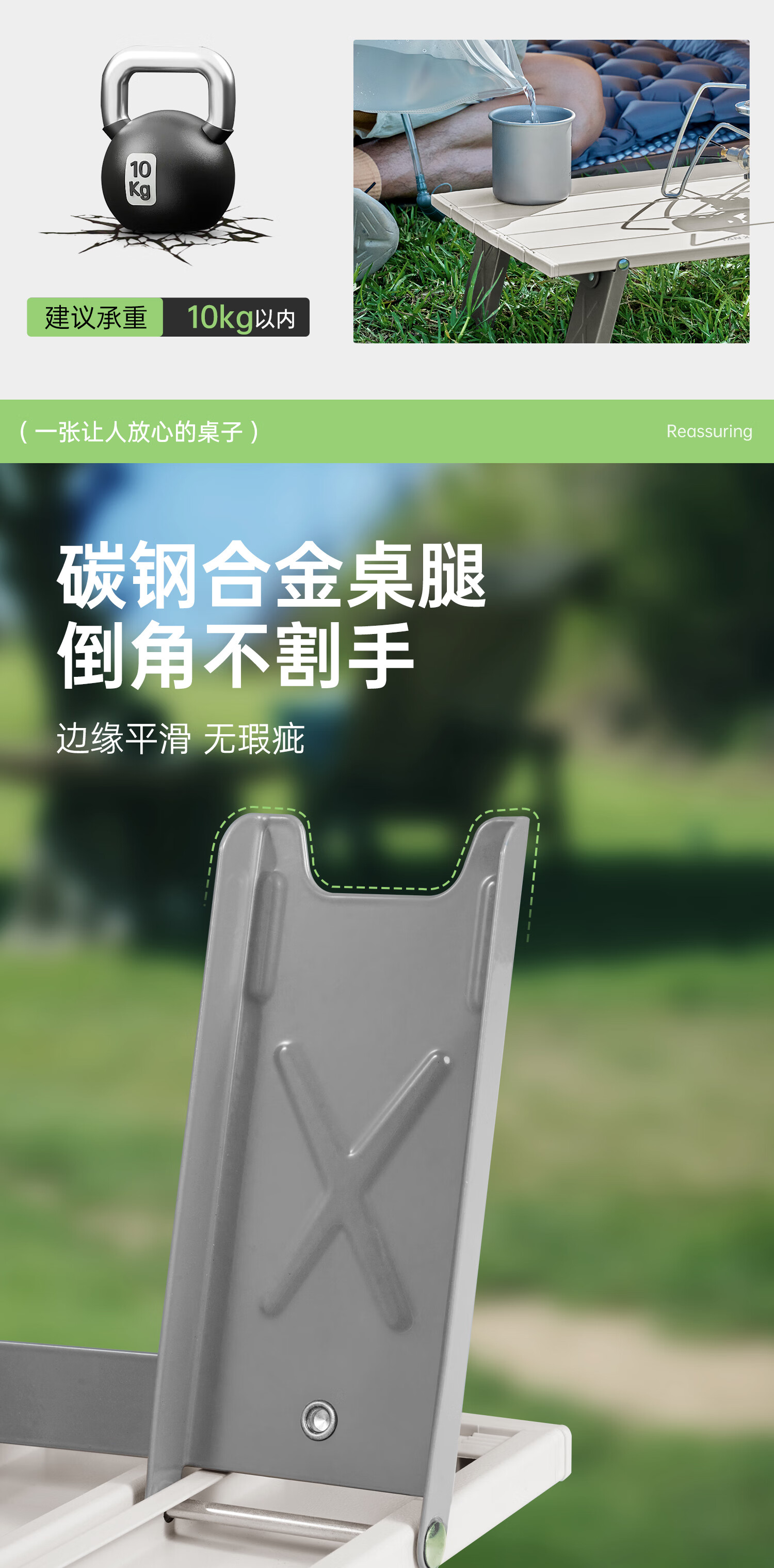 桌子很不错,做工还可以,操作也很方便,有固定孔,打开之后很稳,承重也很高,收纳方便,还有收纳袋,放车上不占地方,出去露营很方便!
