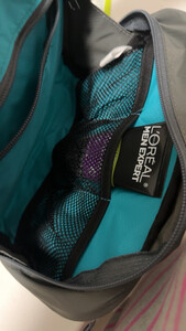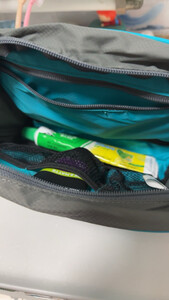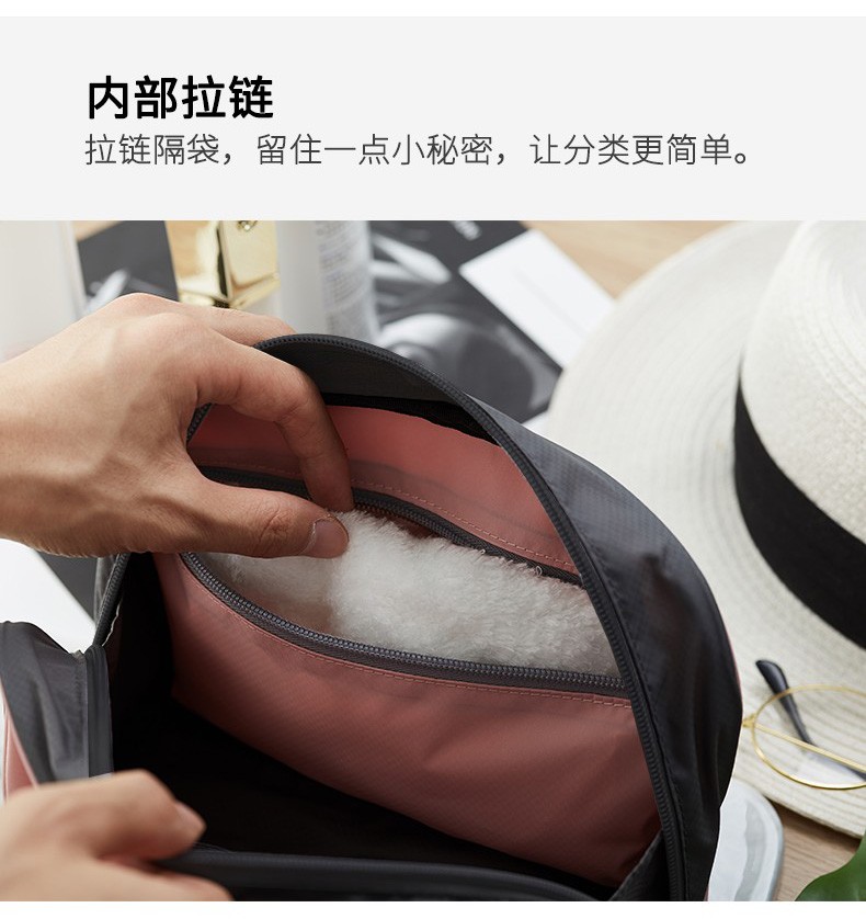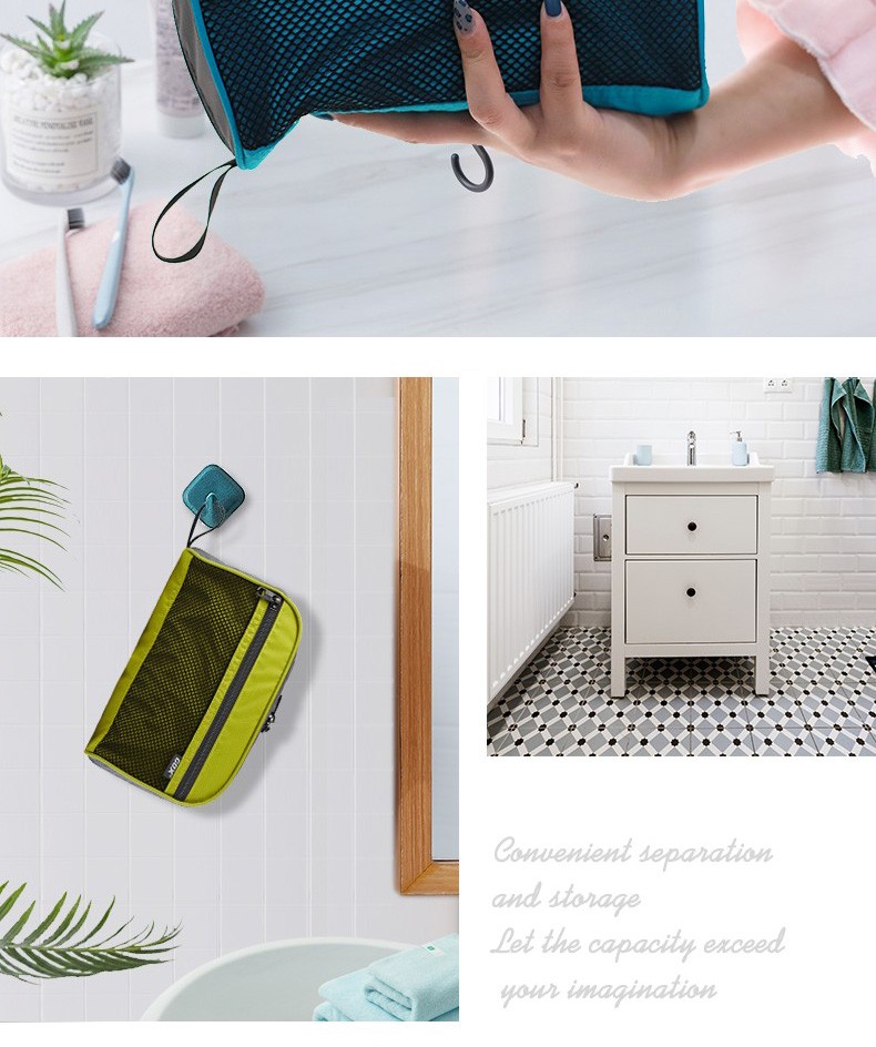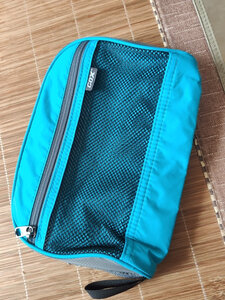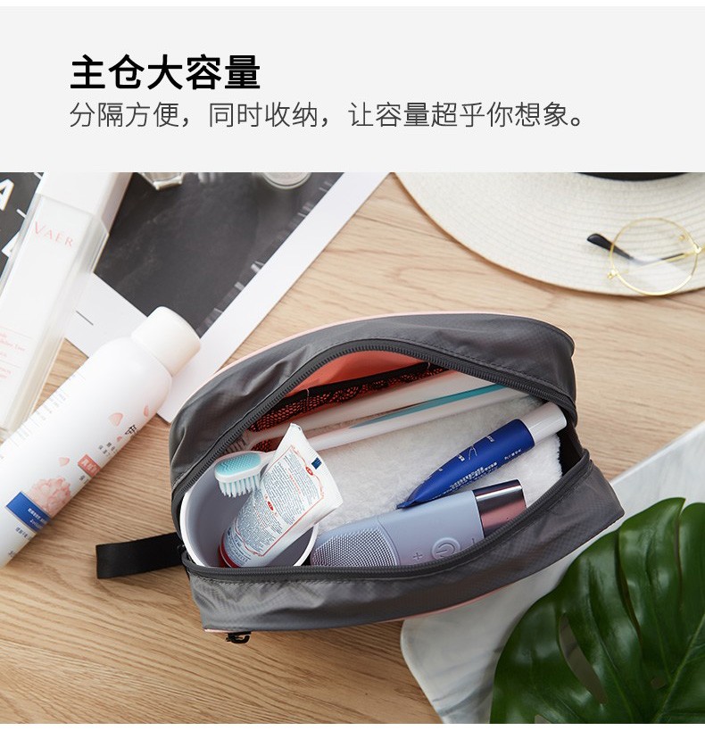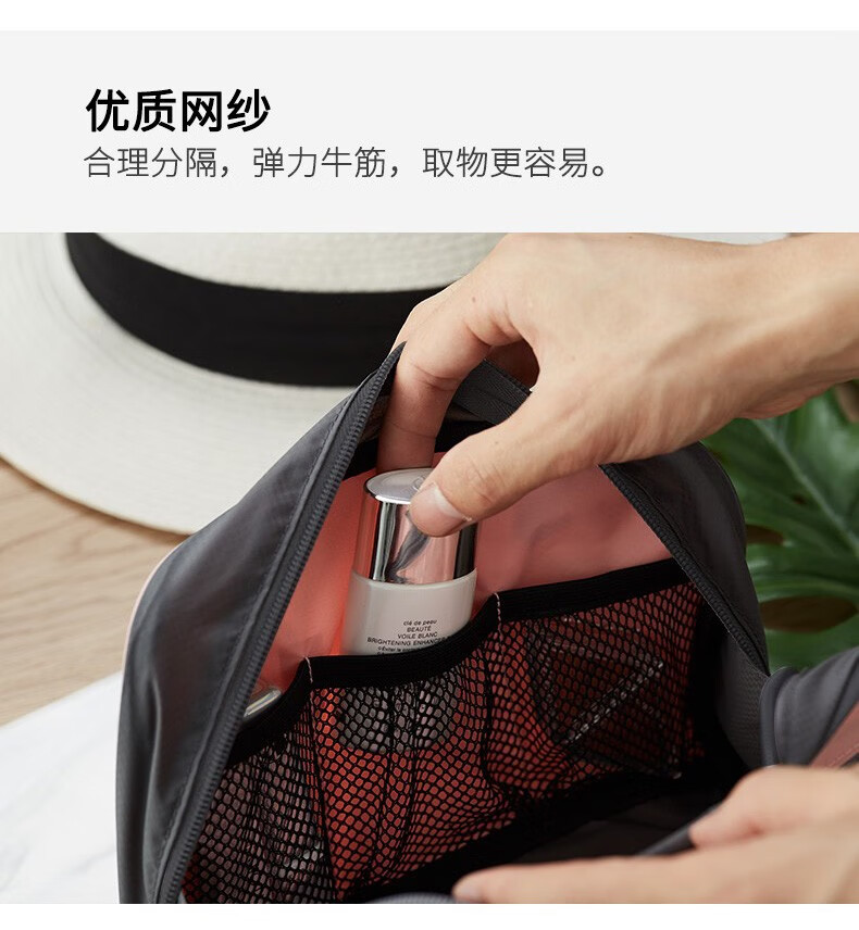 这款洗漱包比较轻薄,还防水,而且分隔比较多,外面有一个拉链的网袋,拉开大袋里面还有一个内拉链的袋,另外还有三个网布的分隔,分别分区放东西真的方便