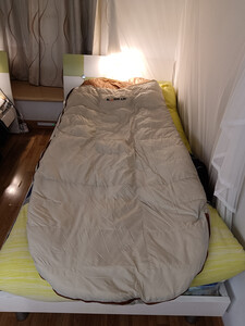 睡袋质感很好,轻。躺进去很舒服,需要加枕头。本人身高163,偏胖,躺进去肩膀宽度刚好,两个手搭在肚子上,肘部两边宽度也刚好,没有束缚感,但也没有太多富余空间,两脚打开与肩同宽刚好撑到最宽,舒适度刚好,但想再打开一些就不行了。翻身比较宽松,也可以屈腿睡。如果175身高以上的,可能还是会觉得窄一点,有束缚感,建议买120或更宽的睡袋。保暖度方面,南方冬天10度左右,但我觉得要买-15度以下保暖的才真正够暖。最后就是收纳,打开后睡袋胀开了,再收回去就要排空气,是个体力活。总体不错,适合室内用,不适合野外。
