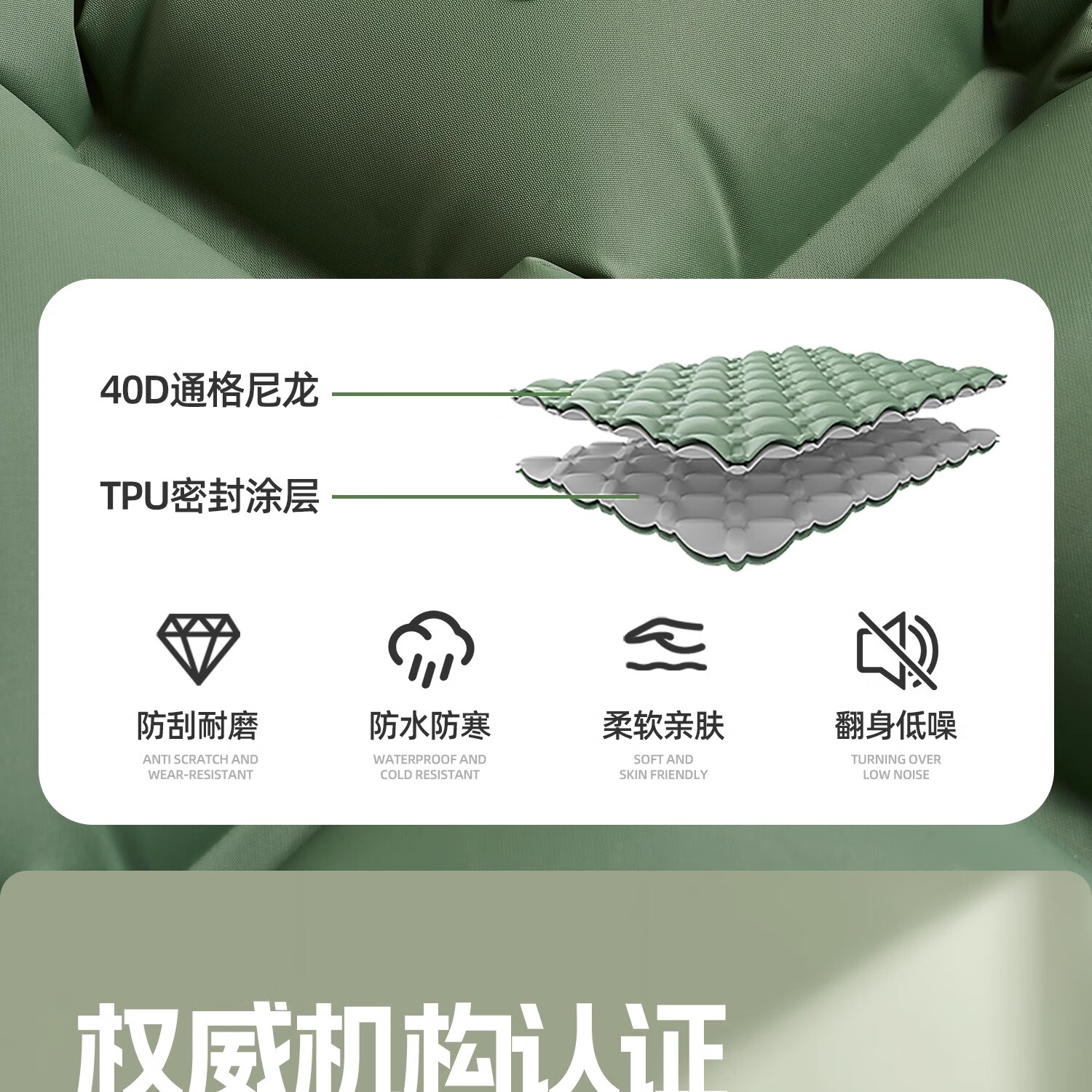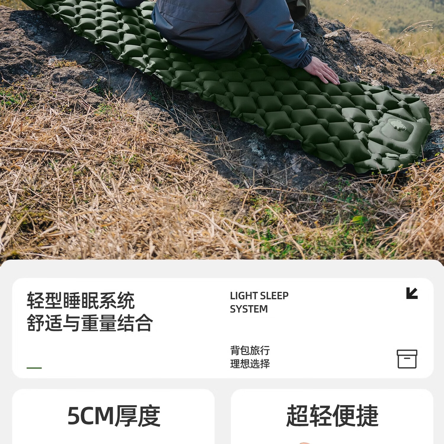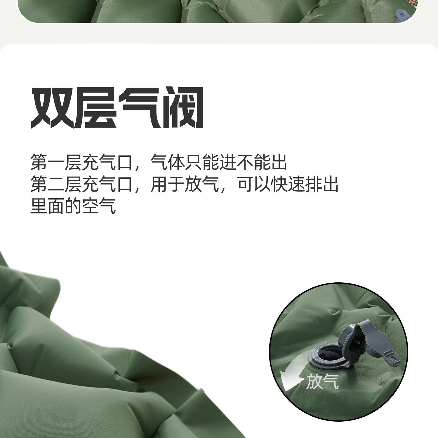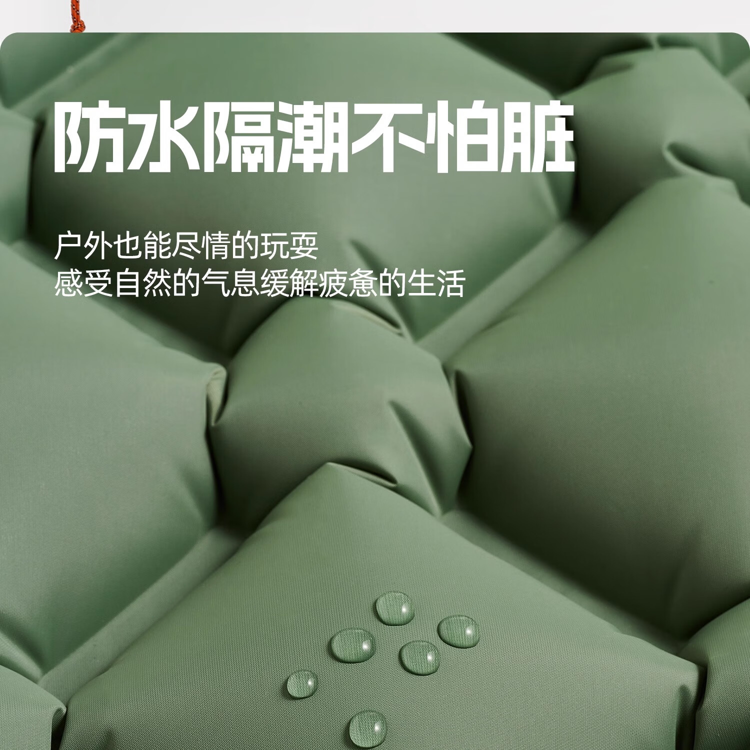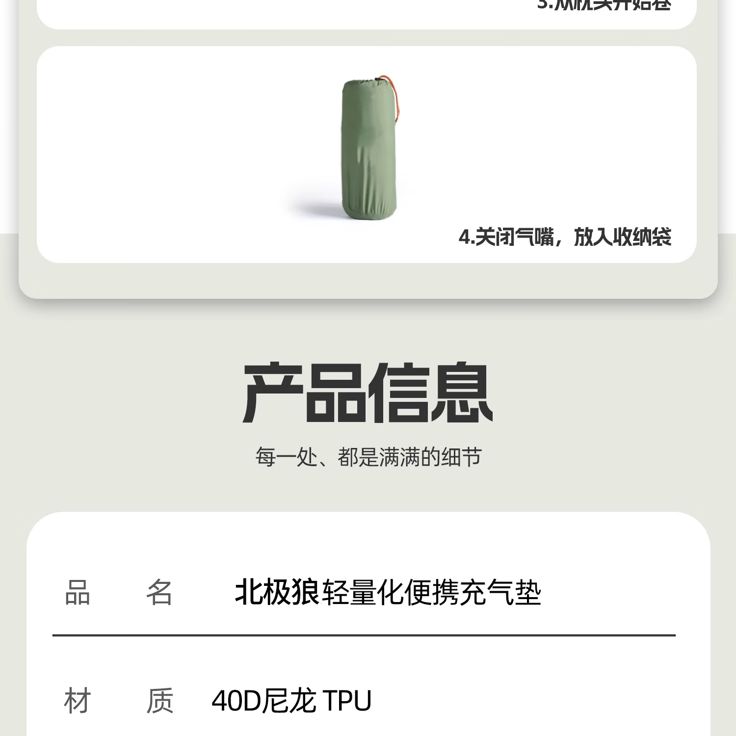 自带手按打气囊和一体式枕头,收纳小巧轻便,方便携带,面料质感不错,美中不足气垫里面没有加泡沫层做缓冲,稍微单薄了一些,降低了整体的舒适性。