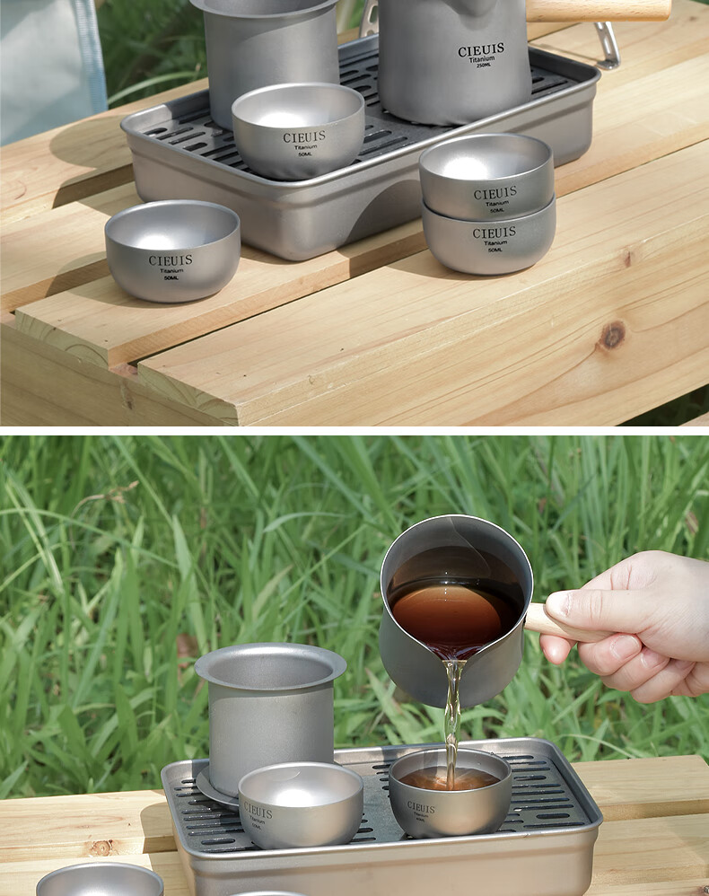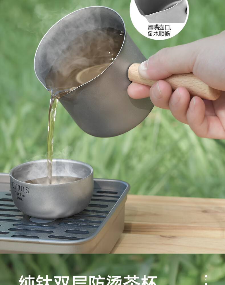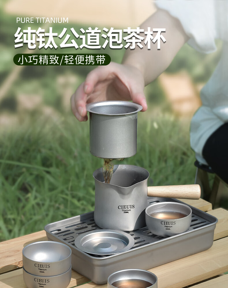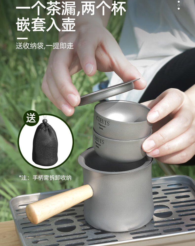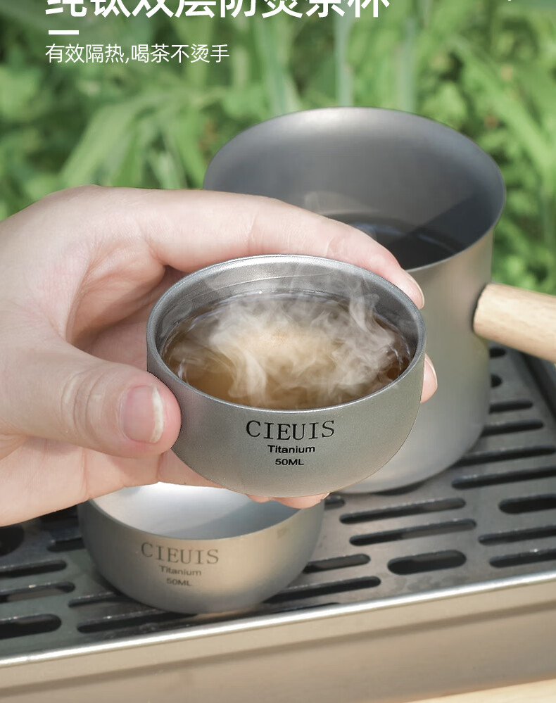 CIEUIS纯钛旅行茶具套装,整体体验非常满意。这套茶具轻便易携,适合户外露营或野营使用。橡木柄设计既美观又实用,手感舒适。茶滤设计精细,能有效过滤茶叶碎屑。两个50毫升杯子的容量适中,满足日常需求