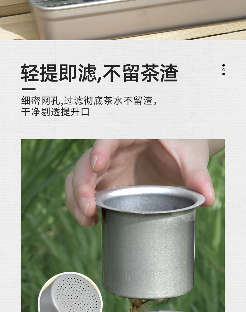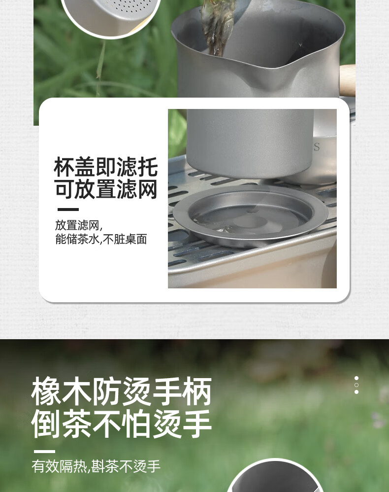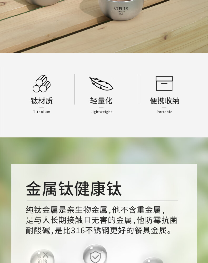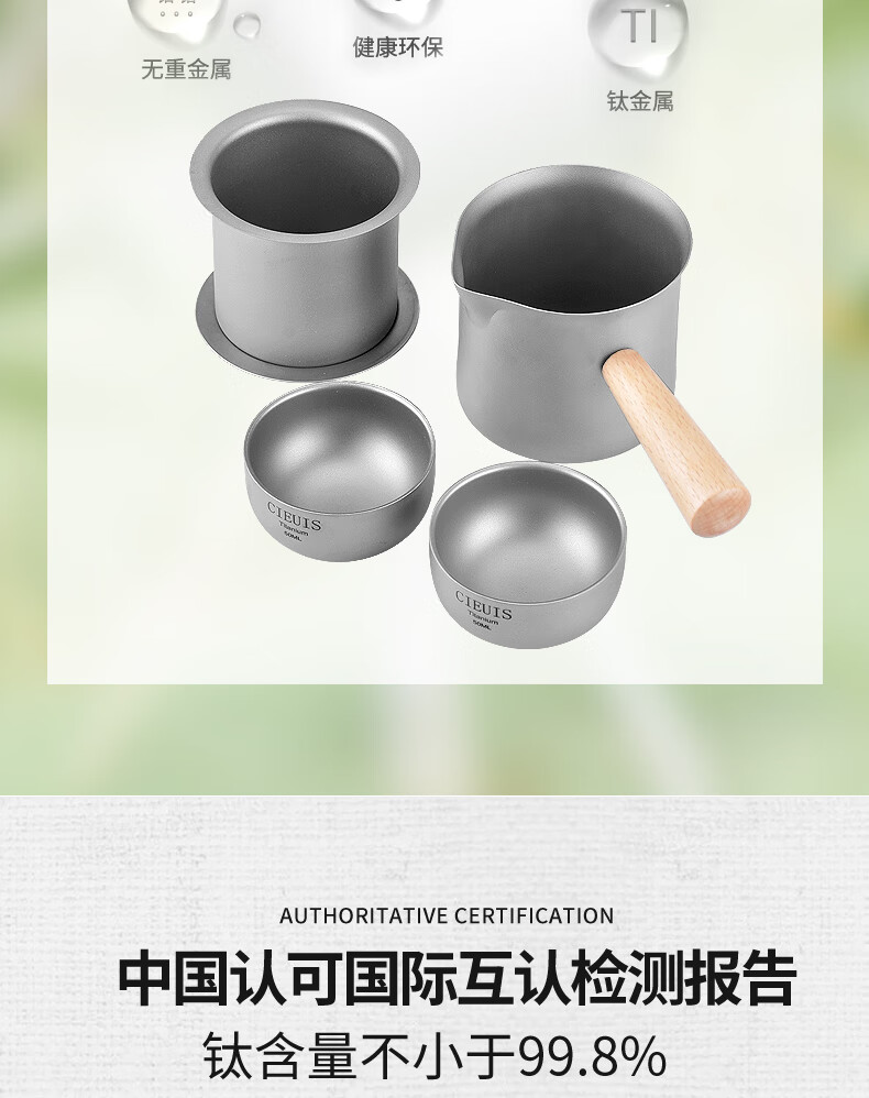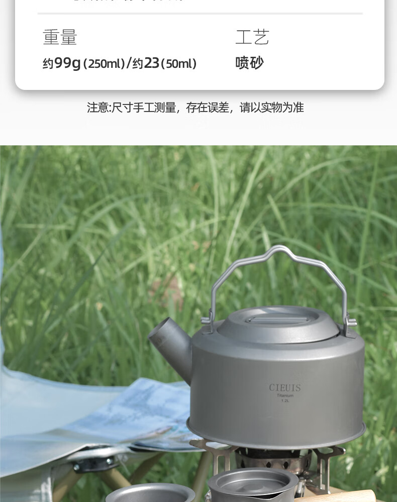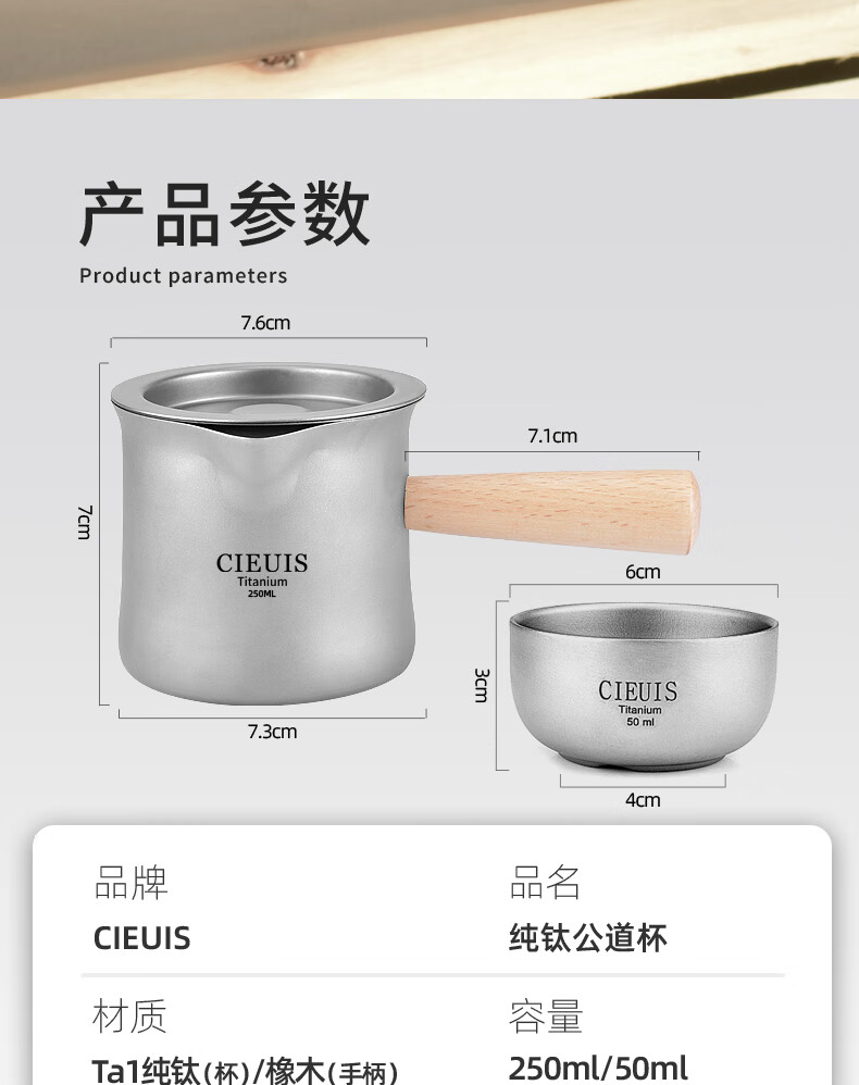 CIEUIS纯钛旅行茶具套装,整体体验非常满意。这套茶具轻便易携,适合户外露营或野营使用。橡木柄设计既美观又实用,手感舒适。茶滤设计精细,能有效过滤茶叶碎屑。两个50毫升杯子的容量适中,满足日常需求