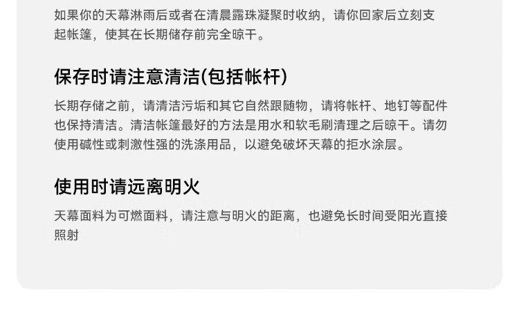 天幕质量很好,中间没有发现漏光的地方。防风绳很粗很结实。性价比很高,喜欢露营的小伙伴可以买回去使用,不过需要自己单独购买撑杆。建议买外面浅色的,看起来大一些 防水效果:很好 适用场景:户外露营 容纳人数:8人没问题 便携性能:收纳袋质量很好,装起来以后不占空间