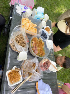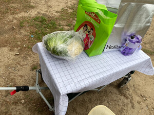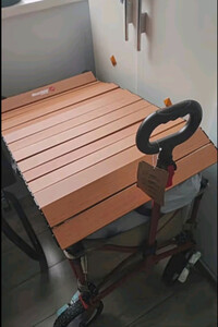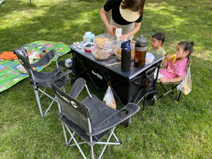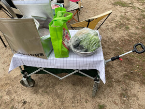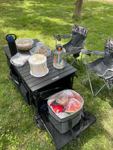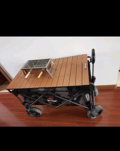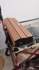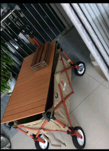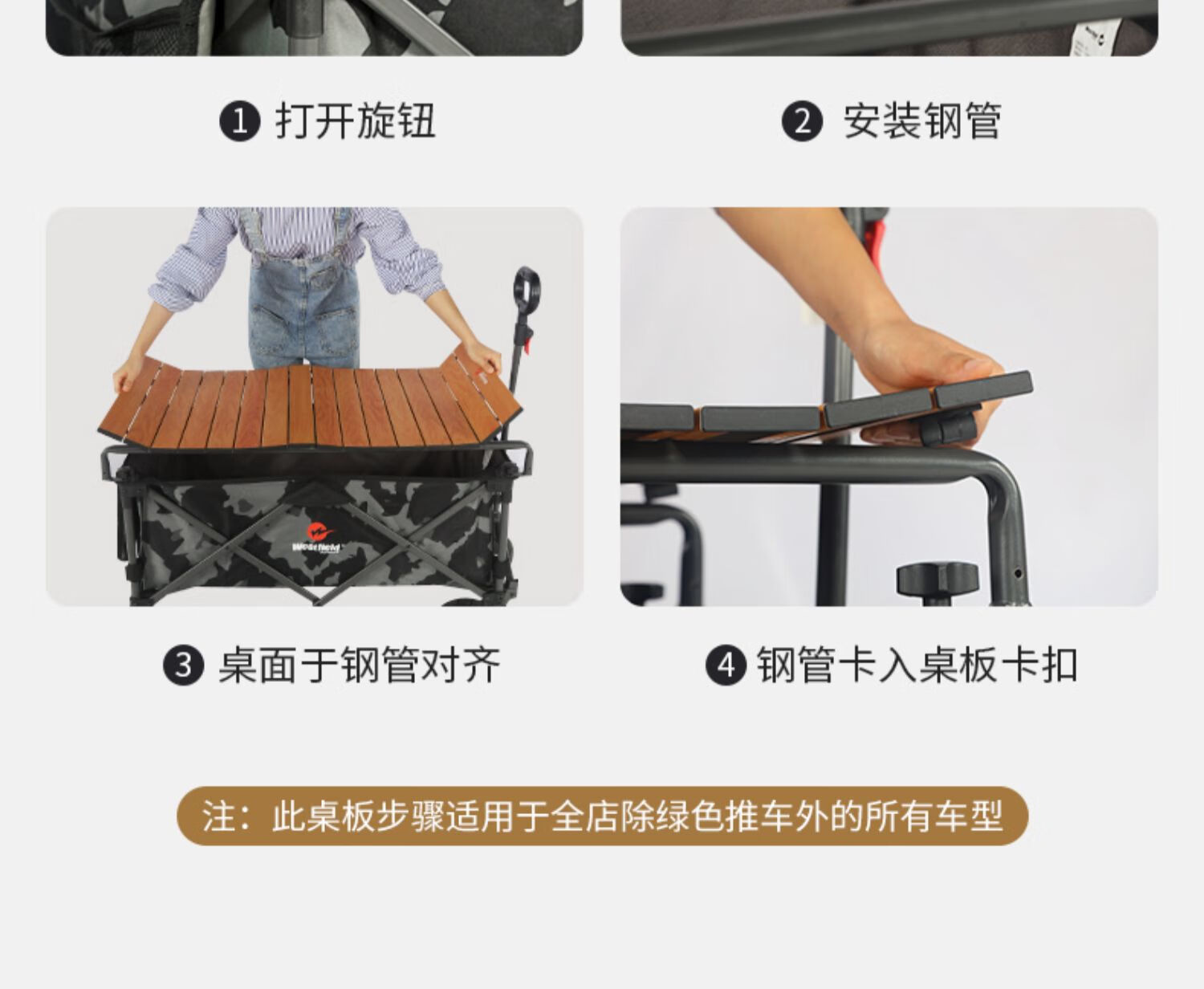 本打算买露营车套装的,可惜买的时候配套的桌板没货,只能先买个露营车等桌板有货了再买桌板。 之前一直是单独带个折叠桌,露营车拉完装备之后就闲置在一旁了。 有了这个桌板,一家5口折叠桌都不用带了,少了好大一个包,也避免了车子的闲置,承重不错并且桌板材质很轻,携带非常方便。 用的时候桌板上一定要铺一块软玻璃,不然汤汤水水的东西会漏下去,桌板边沿和车子收纳袋那里都可以收纳东西,很方便。