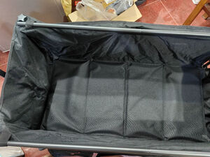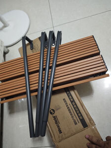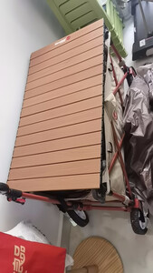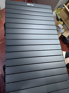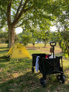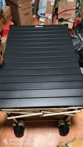 先买的车,夜章款的。 整个车的释放和收纳很方便,前轮还带了刹车,拉杆可以调节长度,收纳280L,承重400斤,坐个人绰绰有余,翻斗放下来138cm长,放露营装备很方便,除了重了点没什么缺点。 后买的桌板,桌板有连杆和露营车连接,卡扣上去很方便,卷起来收纳很好,可以在车上放些东西,很平稳,可以放点吃的。