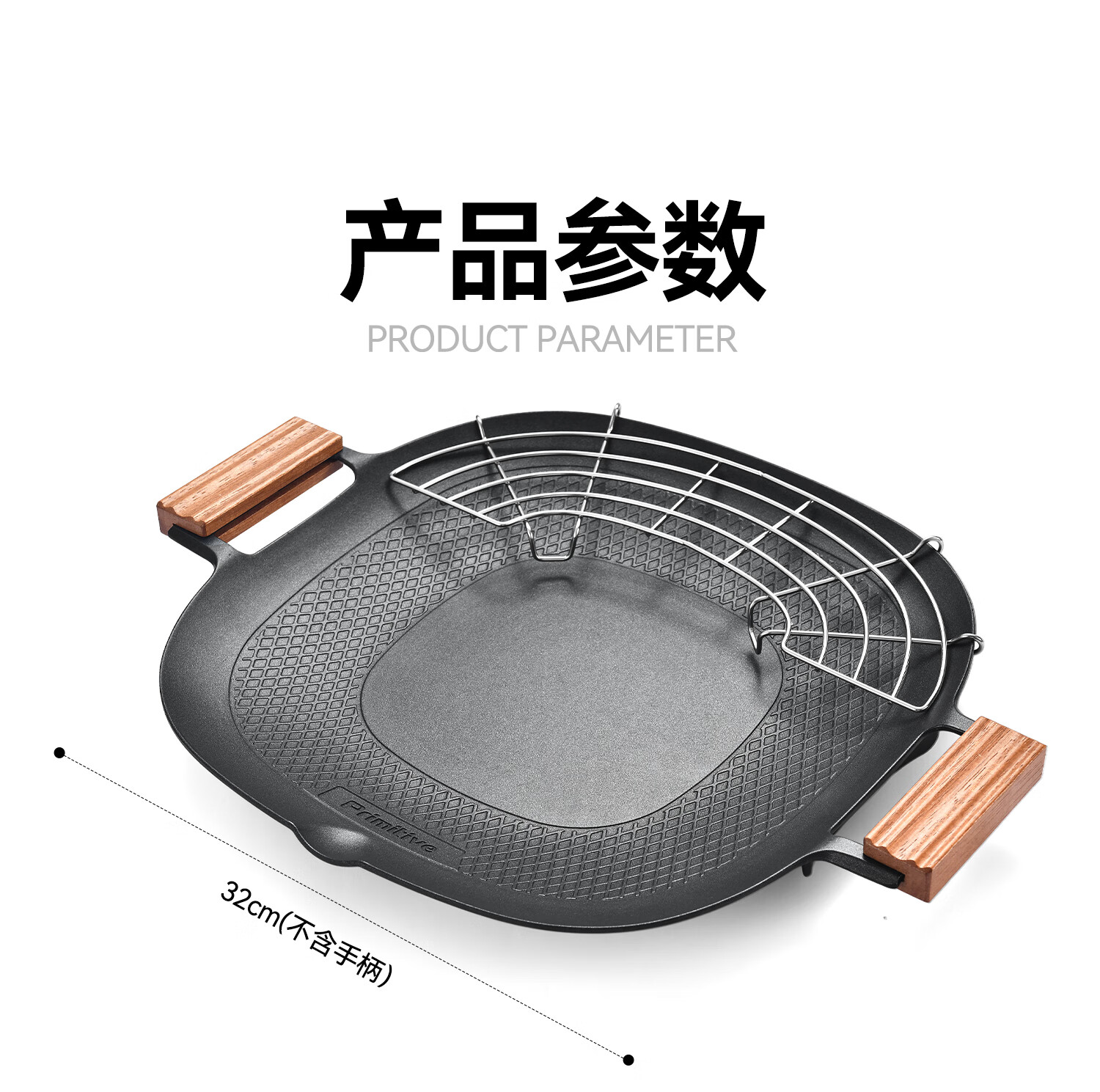 原始人不粘烤盘户外露营卡式炉无烟烤肉煎盘便携式烧烤盘野餐家用防烫 方形烤盘【304不锈钢网+手柄】