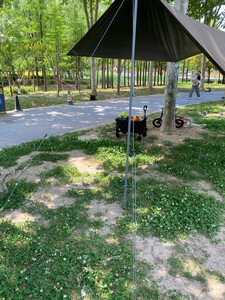 心心念念的挪客天幕终于到货了,迫不及待的地打开手提袋,看到:2根2米多的支撑杆配个收纳袋,8个地钉和8根防风绳配个收纳袋,非常不错,做工精细,找时间出去试试!