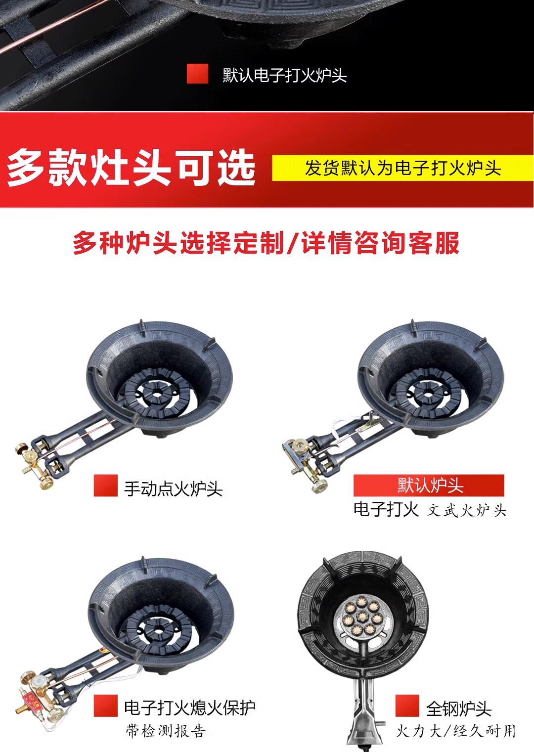 默认发液化气炉头,天然气需联系客服 默认手动点火,电动点火炉头需联系客服