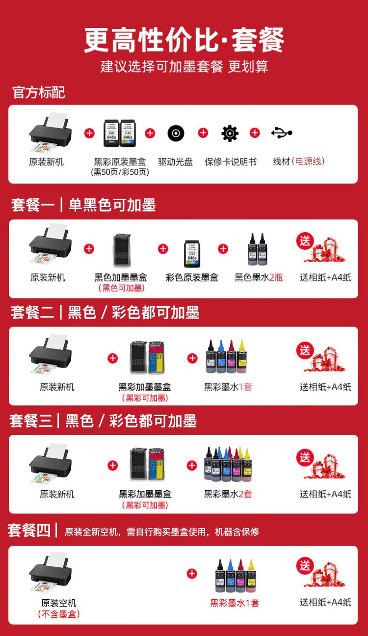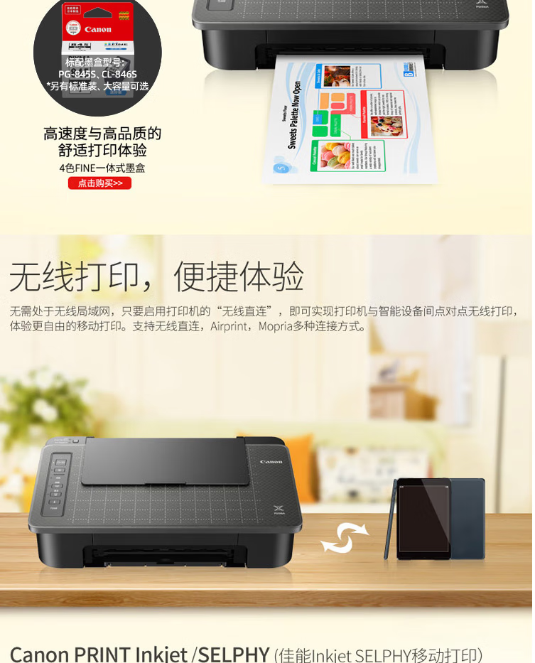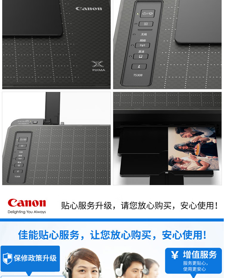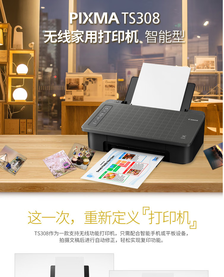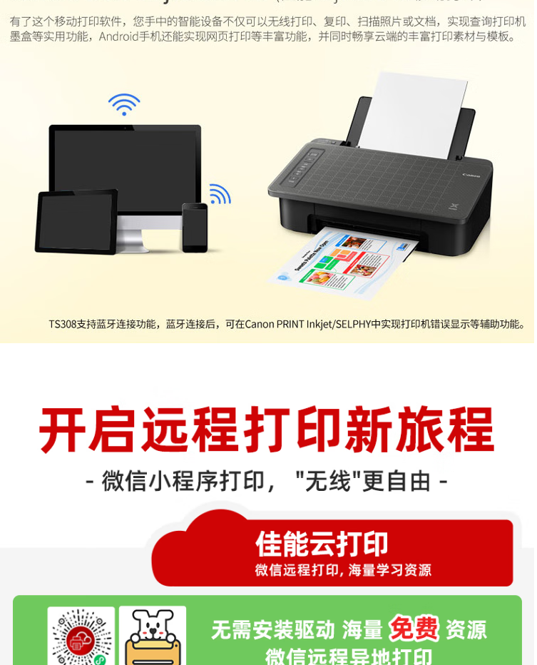 佳能家用打印机TS308手机图片文档学生作业无线打印 微信远程打印 TS308(手机无线/微信远程) 套餐一(主机+黑色加墨+墨水2瓶)