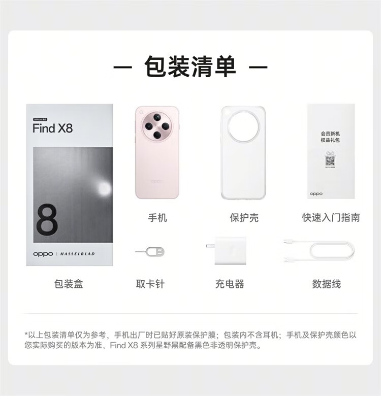 包装盒 × 1 手机 × 1 数据线 × 1 充电器 × 1 取卡针 × 1 保护壳 × 1 快速入门指南 × 1 *以上包装清单仅为参考,手机出厂时已贴好原装保护膜;包装内不含耳机