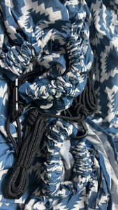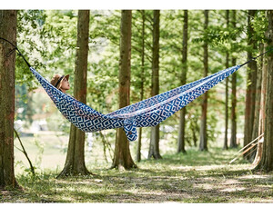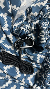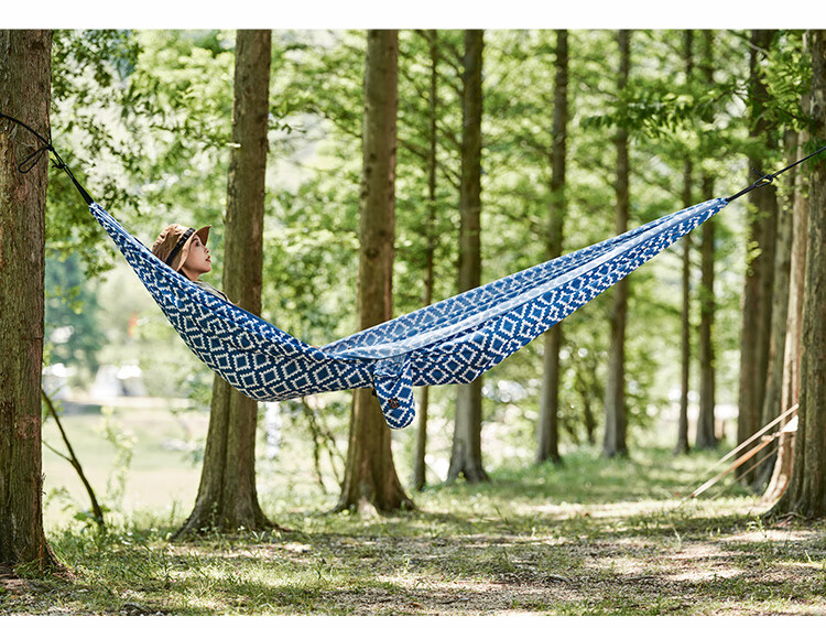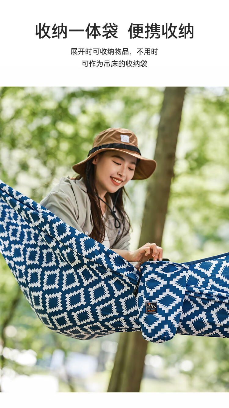 这个小吊床非常实用,不像那种棉麻质地的吊床,真的是轻多了,携带还特别方便,卷起来大小和围巾一样,更适合有孩子的家庭,绑在树上很牢固,即大又结实,能沉重两个大人外加孩子都没问题,布料质地密实,而且收纳袋和吊床是连着一体的,打开是不用担心随手放而弄丢的问题,图案很是让人心境凉爽,非常喜欢
