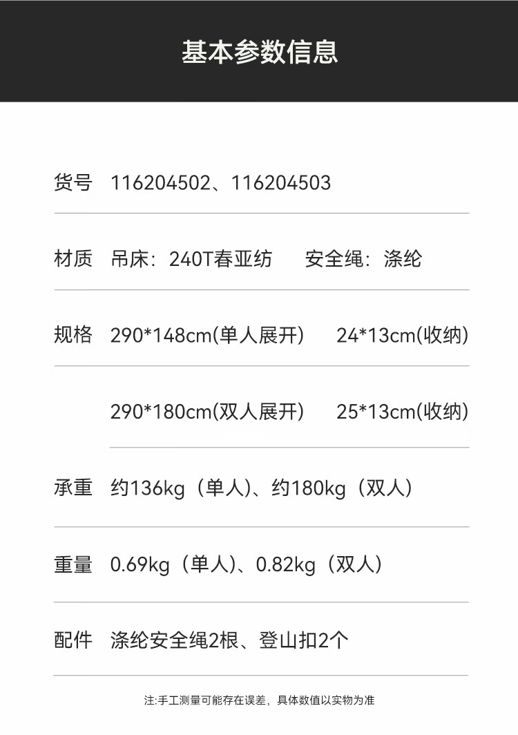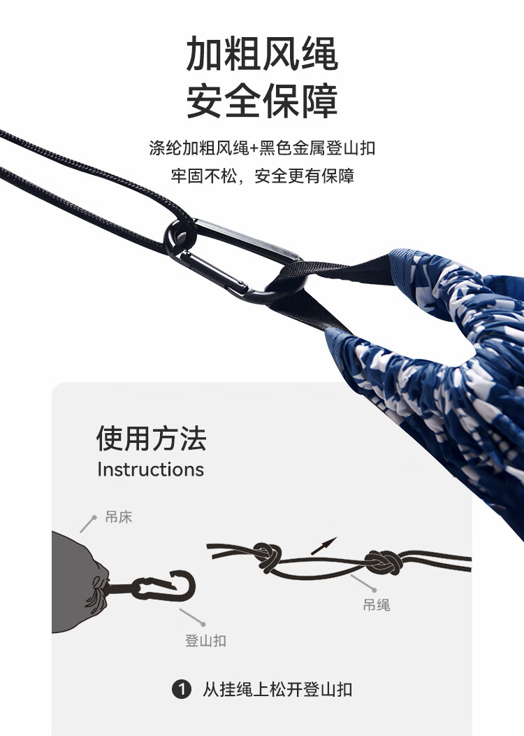这款吊床面料厚实耐磨,承重稳稳的,躺上去晃悠着特别舒服。安装简单,挂钩牢固不打滑,户外露营挂在树上,晒着太阳打个盹儿太惬意了。收纳也方便,折叠起来不占地方,性价比超高!