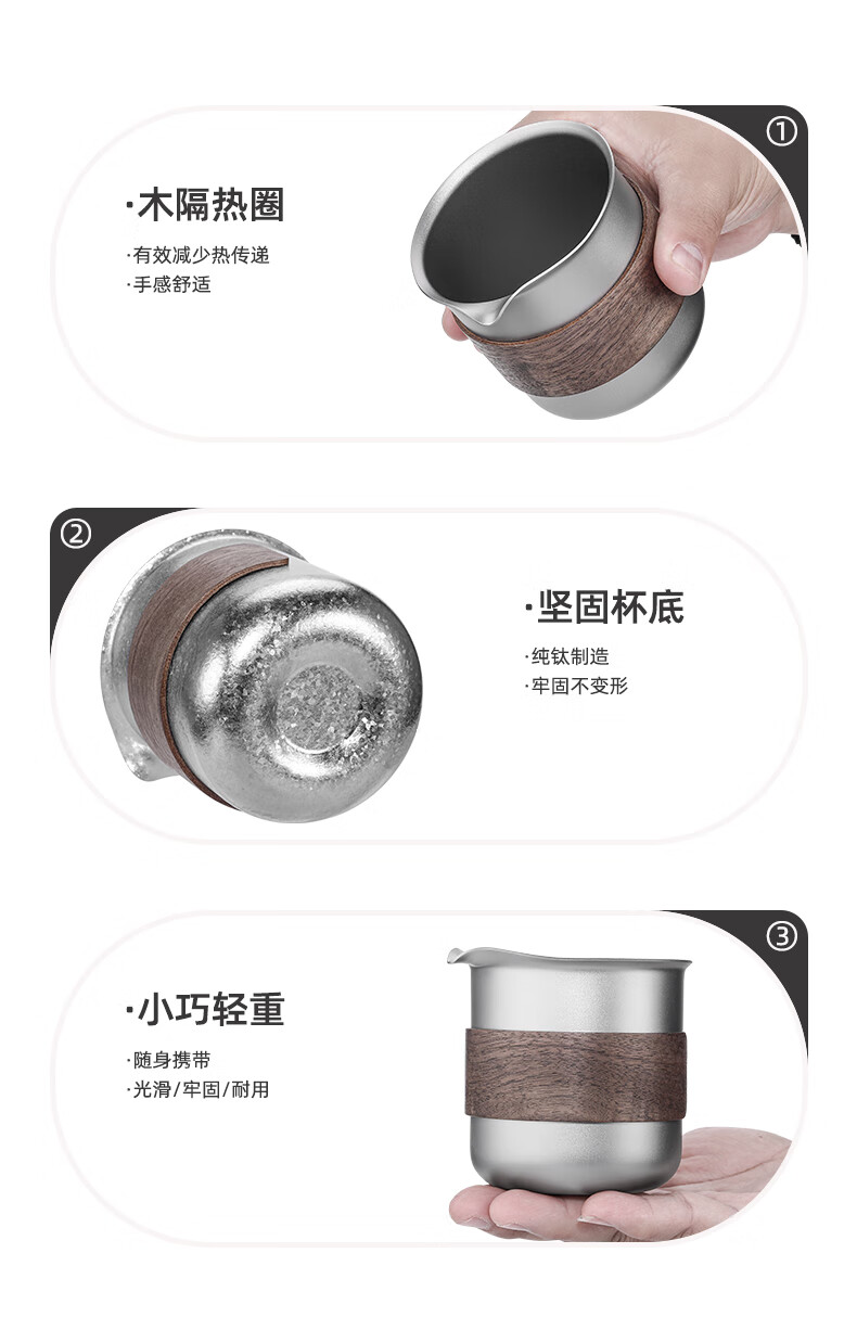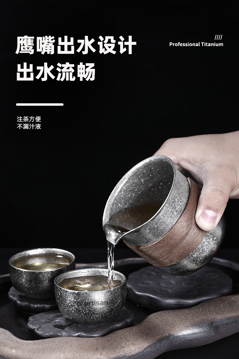 这款纯钛轻便耐用,抗腐蚀性强,适合泡茶分汤,且不会与茶汤发生反应,保留原味。导流口设计方便倒茶,可搭配茶漏使用。分茶均匀,适合多人分享;旅行携带方便,但需注意纯钛材质较软,避免磕碰划痕。