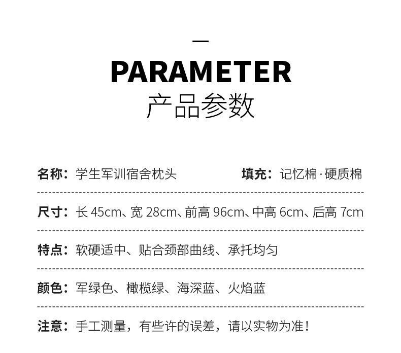际华三五零五04内务枕头乳胶枕硬质棉定型高低枕头制绿式训练记忆枕头宿舍单人 硬质棉【军绿色】带枕套 44*25*7*9cm